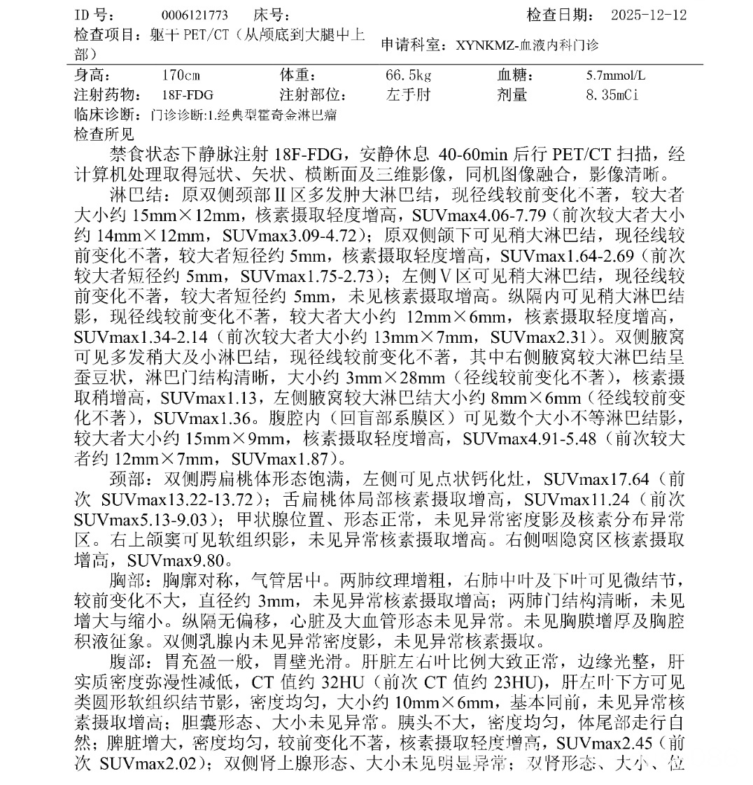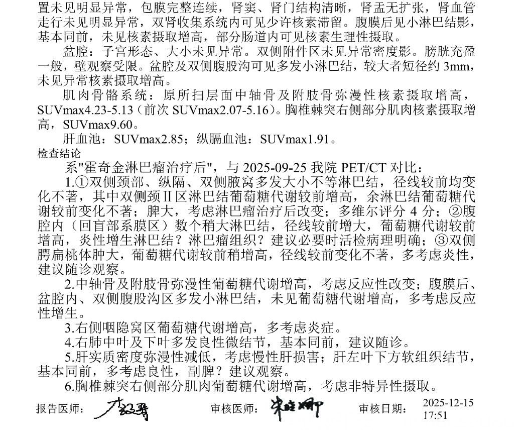见上条帖子,b超显示腋下淋巴结增大,医生怀疑疾病进展,做了petCT腋下摄取很低,排除了疾病进展,