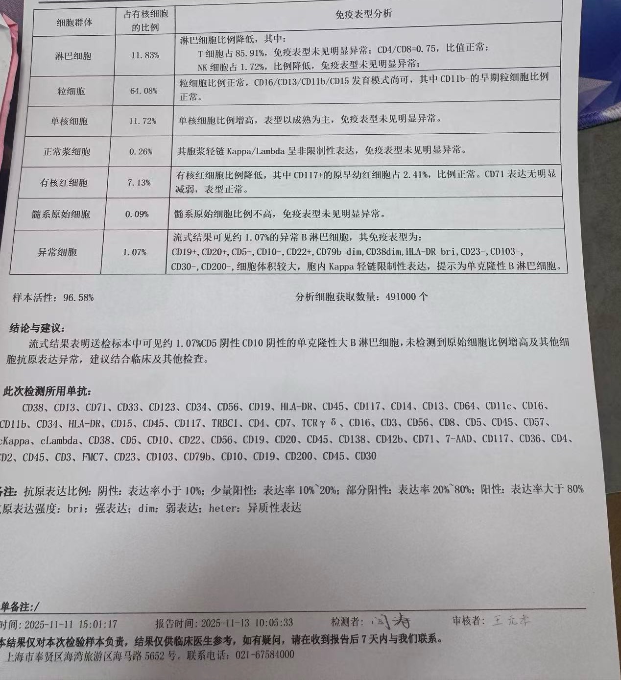 你的情况和我父亲一模一样,只不过你是B细胞他是T细胞。
