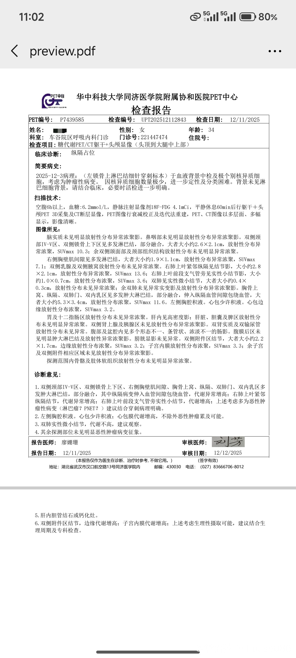 锁骨上方和ebus各穿刺1次,锁骨上活检一次,目前还在等活检的病理报告,说是做了3组免疫组化没做出来,现在在进行基因重排,我的淋巴瘤分型咋这么难查呢?目前脸也肿了,锁骨上淋巴鼓的好高,喉咙也不舒服,影响吞咽了,治疗还是遥遥无期,好着急啊!