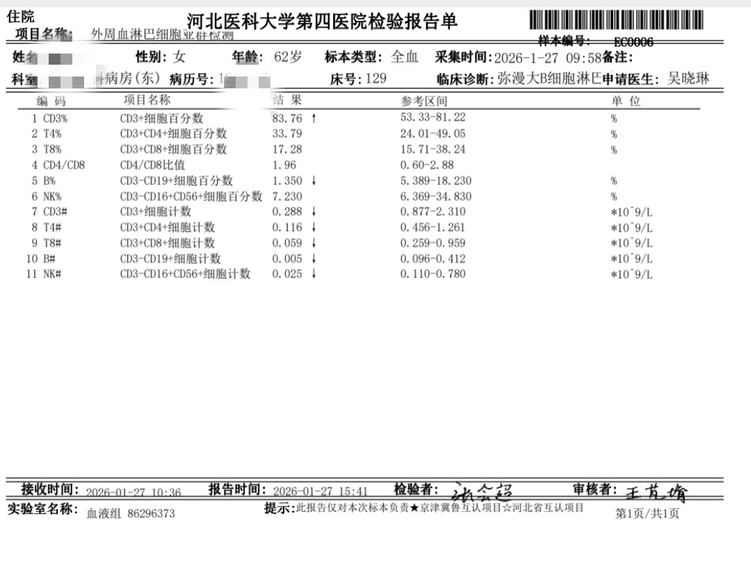 我母亲62岁确诊弥漫大b细胞瘤,rchop治疗一次,这个是2疗前的血液检测,自己看不太懂,,,请教大家帮忙看看