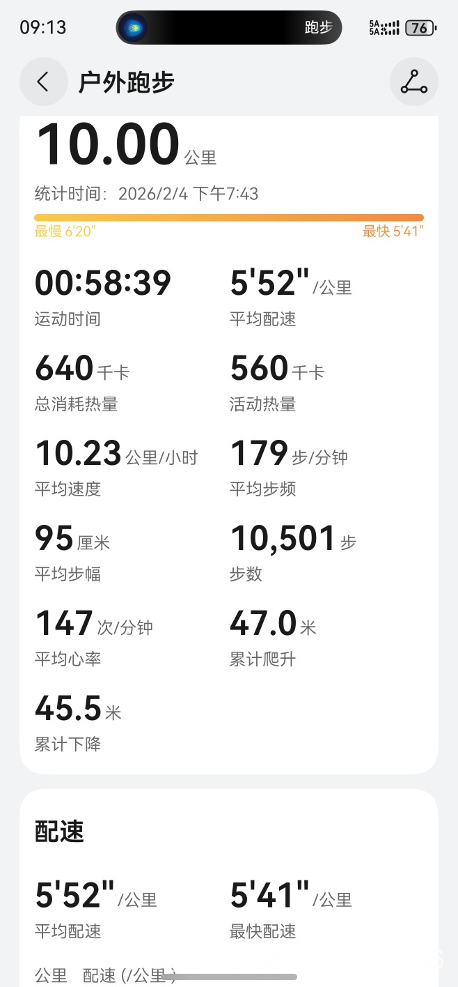 晚上出门继续夜跑打卡10公里结束。今天跑步状态还挺不错,十公里跑进一小时了。