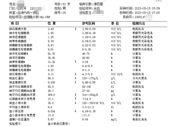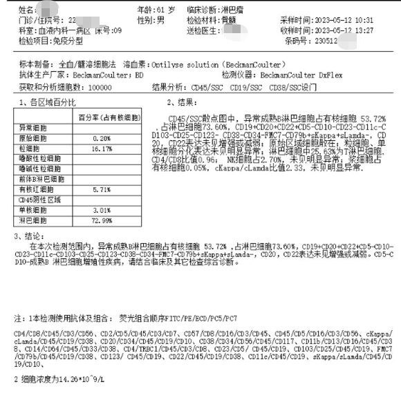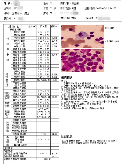 爸爸5月初因为一次半夜的呕吐严重虚汗等症状第二天去医院做了体检,结果显示血小板只有57,然后进行了进一步的检查,根据下面检查医生初步判断为B细胞淋巴瘤四期,医生说具体分类还要再做检查,群里的大神帮看看,感谢!