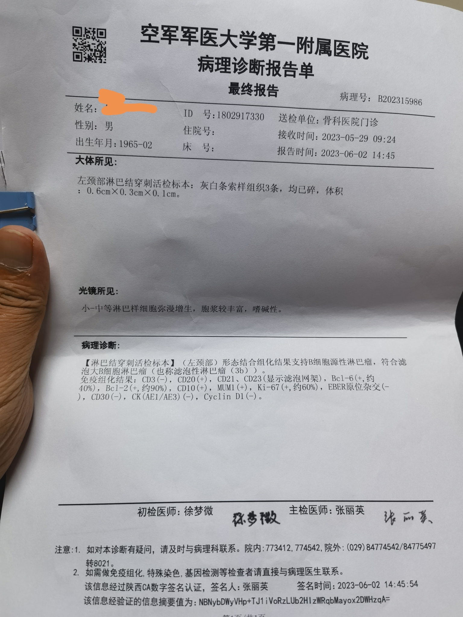 根据你目前的相关报告,个人倾向认为治疗结局类似于滤泡淋巴瘤3a。只是稳妥起见,推荐G/R+CHOP化疗。