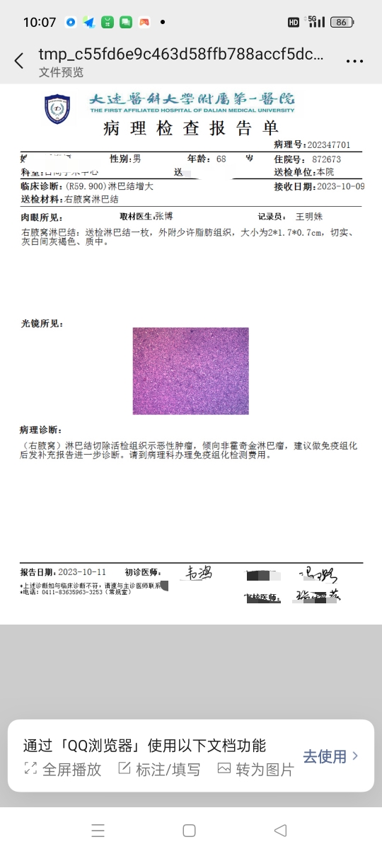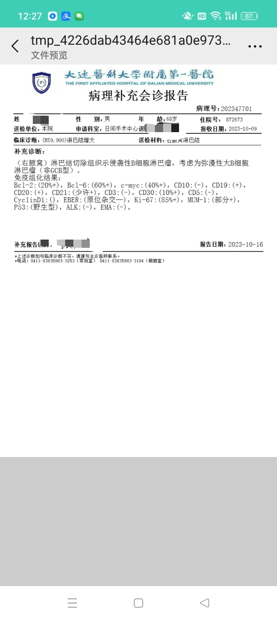 XZ。 发表于 2023-10-18 10:35 病理已经出来了,弥漫大B,不放心可以去大一点的医院做个病理会诊。还需要做fish排除下高级别大B,赶紧吧,病情进展快,和时间赛跑