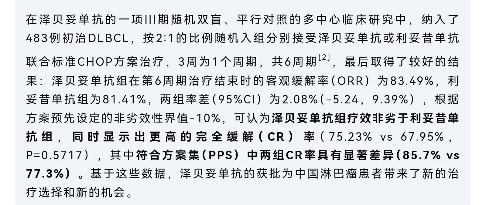 从公布的临床试验数据来看,在ORR上不劣效于美罗华,在PPS患者中CR率高于美罗华而且具有统计学意义,但是由于试验的主要终点是ORR,而CR率只是次要终点,次要终点可以为治疗效果提供额外证据,但本身不足以为药物申请或增加适应症提供可以信服的证据,所以,不能下结论说优于美罗华,只能说等效,同时存在优于美罗华的可能性。