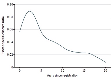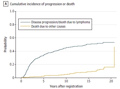 原因特异性风险曲线表示淋巴瘤进展或淋巴瘤相关死亡随时间变化的平滑速率。该曲线的下降趋势表明,随着随访时间的延长,淋巴瘤相关事件的风险逐渐降低,至20年时已接近普通人群的水平,支持部分患者可实现治愈的观点。
