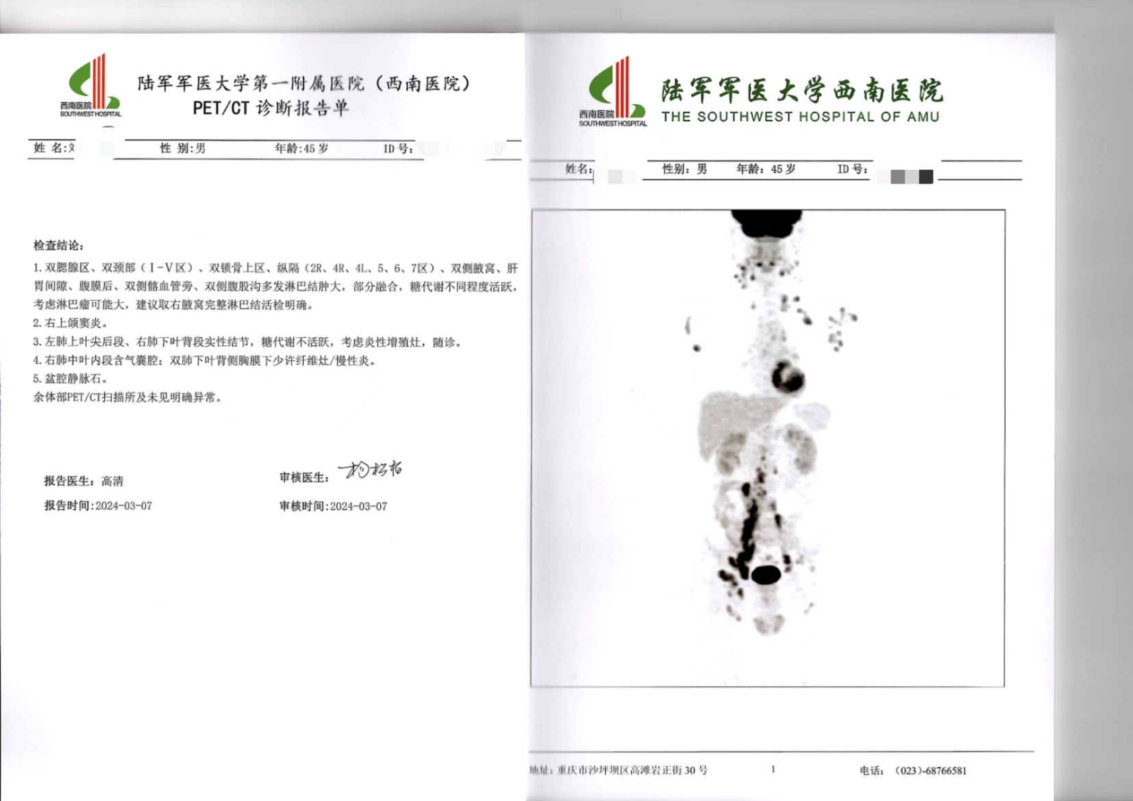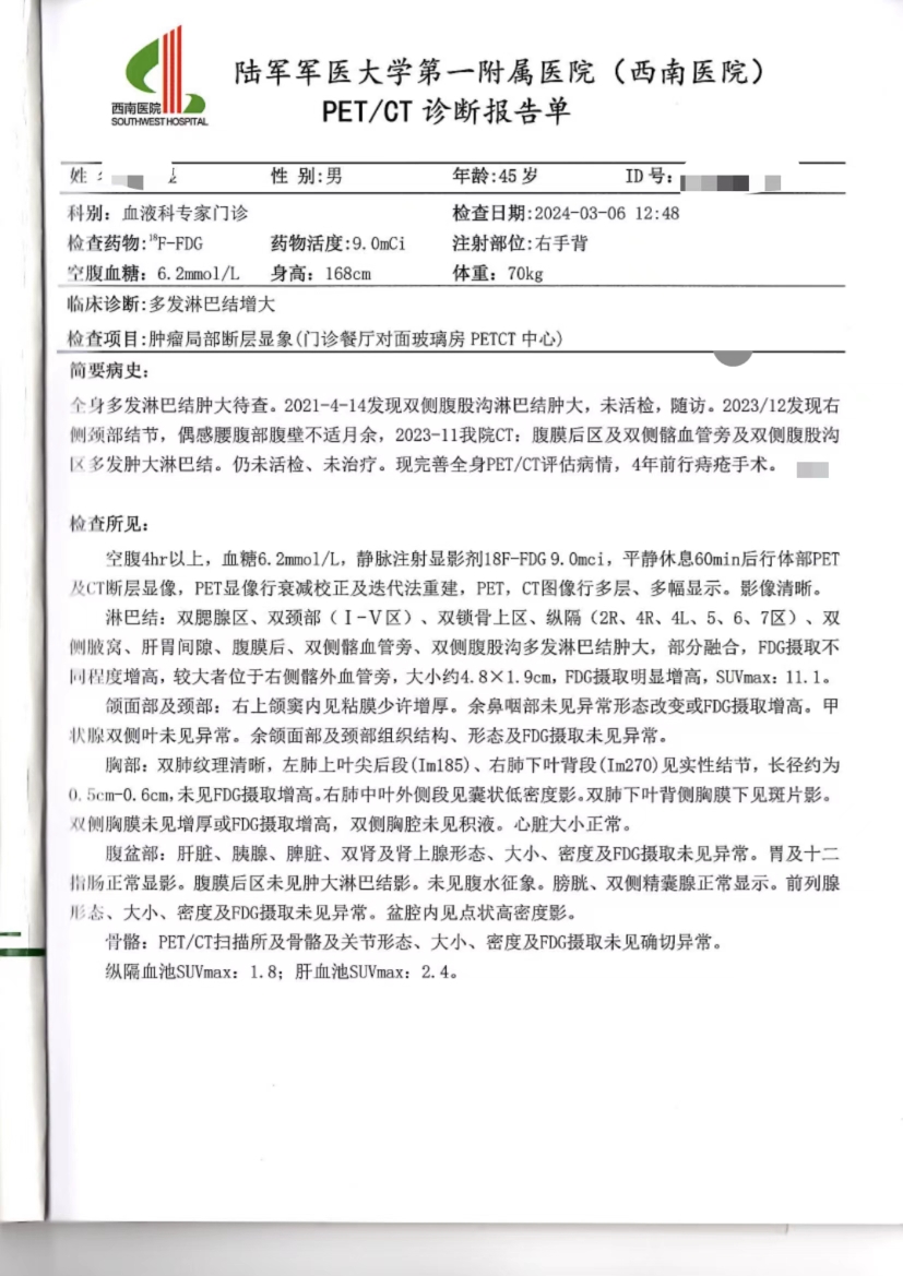 点点青禾 发表于 2024-04-08 23:17 非专业意见仅供参考: 1.petct没有骨髓异常是好消息,但也许仍然需要做骨髓穿刺 2.接下来就看什么方案治疗了,45岁还年轻,再加上SUVmax也有11?猜测会用强一点的方案? 3.你的病理并不是很明确,稳妥起见切个淋巴结重做病理?