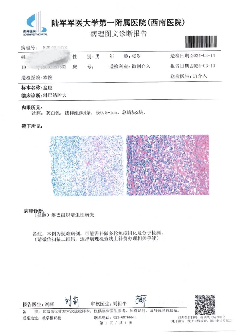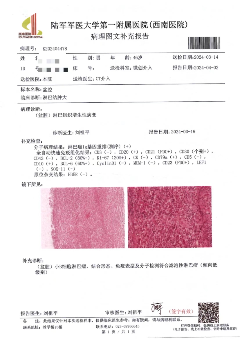 不确定 发表于 2024-04-16 21:07 雨丝大神请解惑:上周在中肿取了右侧腹股沟淋巴结来做病理检查, 到今天已出了二项结果,其中IGH,IGK,IGL全是阴性,是否推翻了在重庆做的病理结果?今天APP提示交费,又加做两项免疫组化和加做FISH,这种属于那种情况?