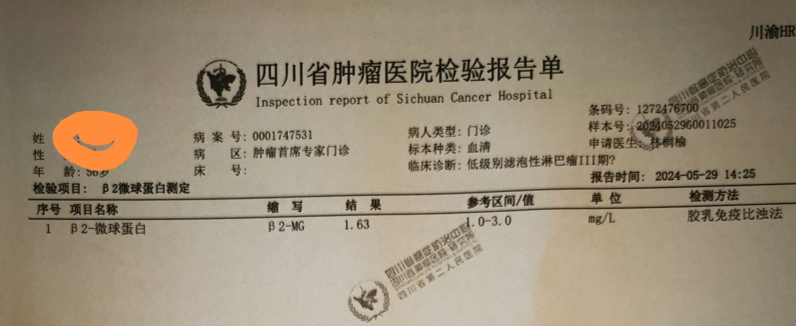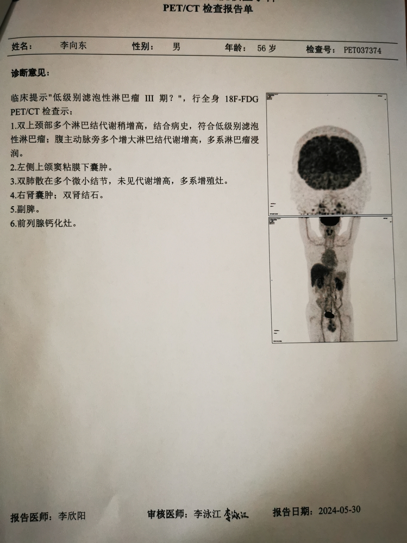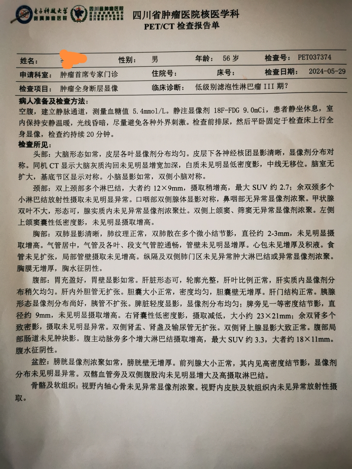 至少3期了,骨穿还没做,也许4期了。治愈是不可能的。还是想先观察一下。有乏力,腹痛症状,偶尔轻度盗汗,不太严重。1月12日颔下淋巴结短径0.7厘米,5月6日短径长到1厘米,手术活检查出低级别滤泡淋巴瘤,ki67 30%左右,不知这条是否符合肿瘤进展治疗指征?