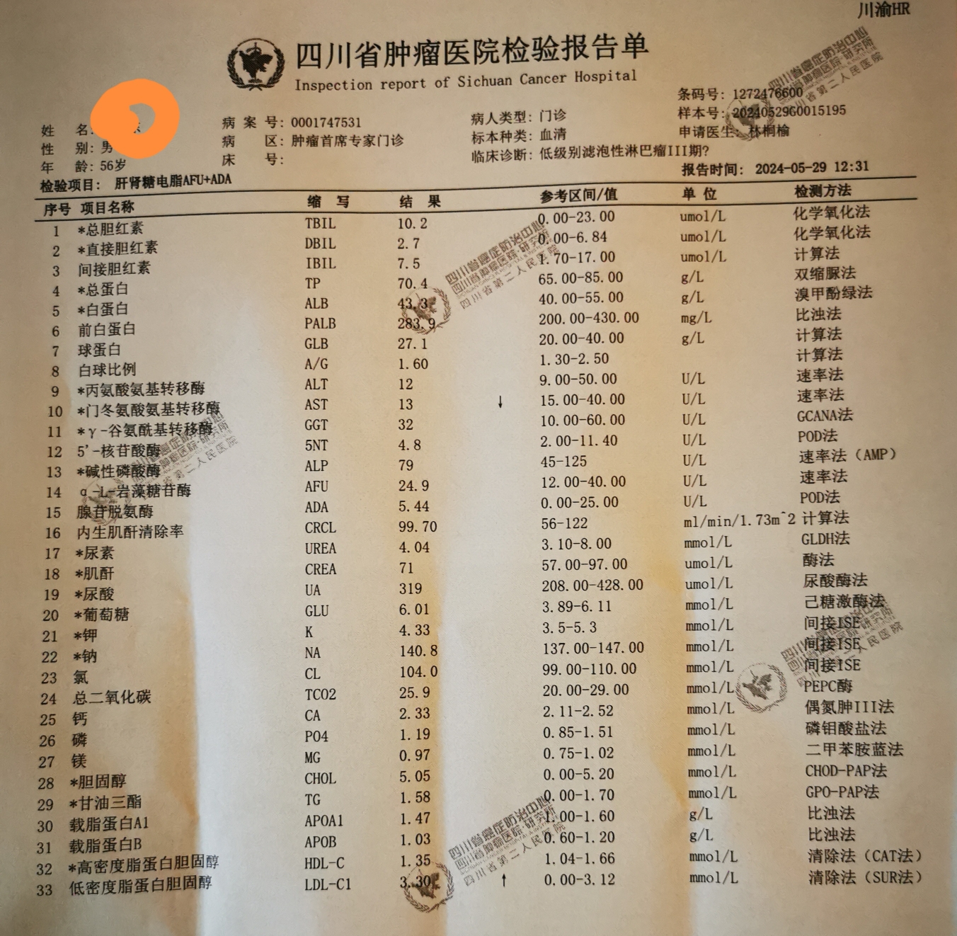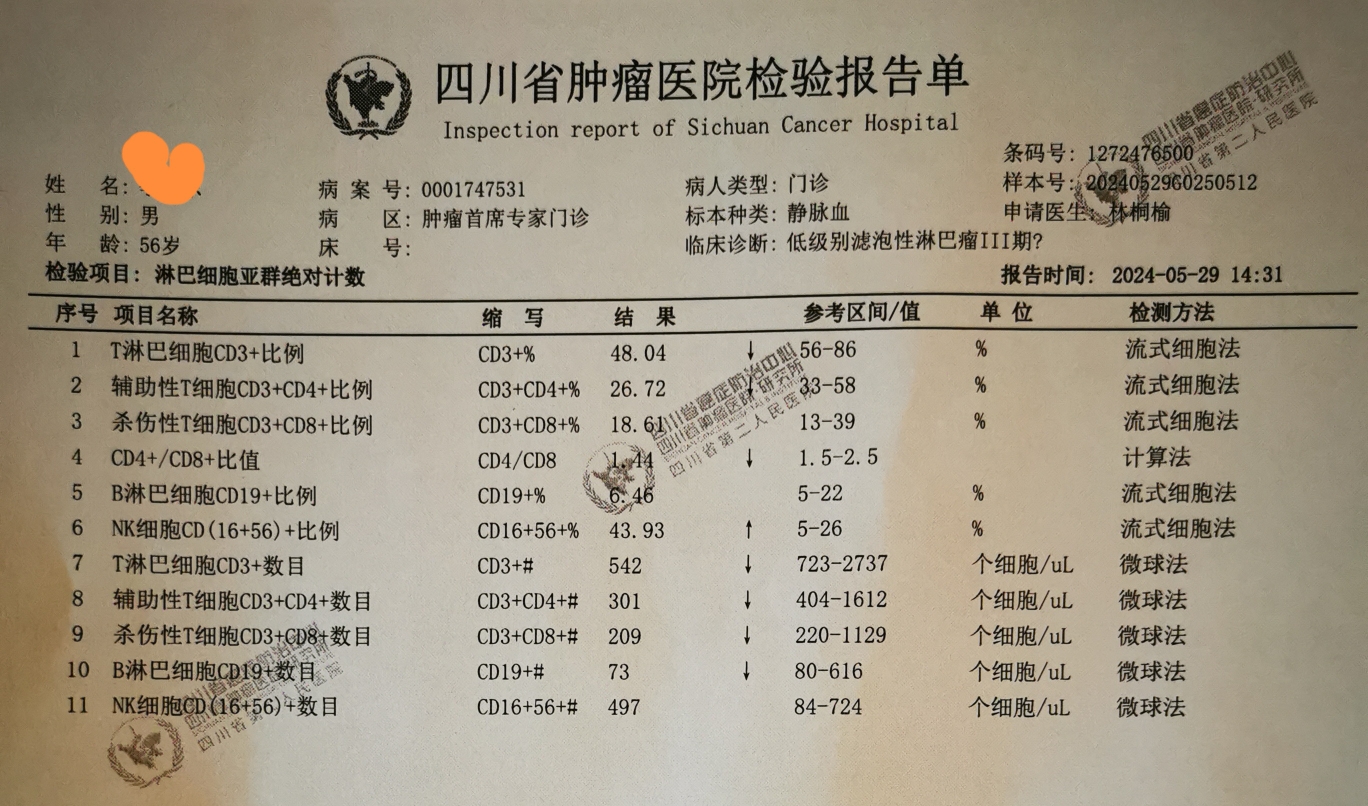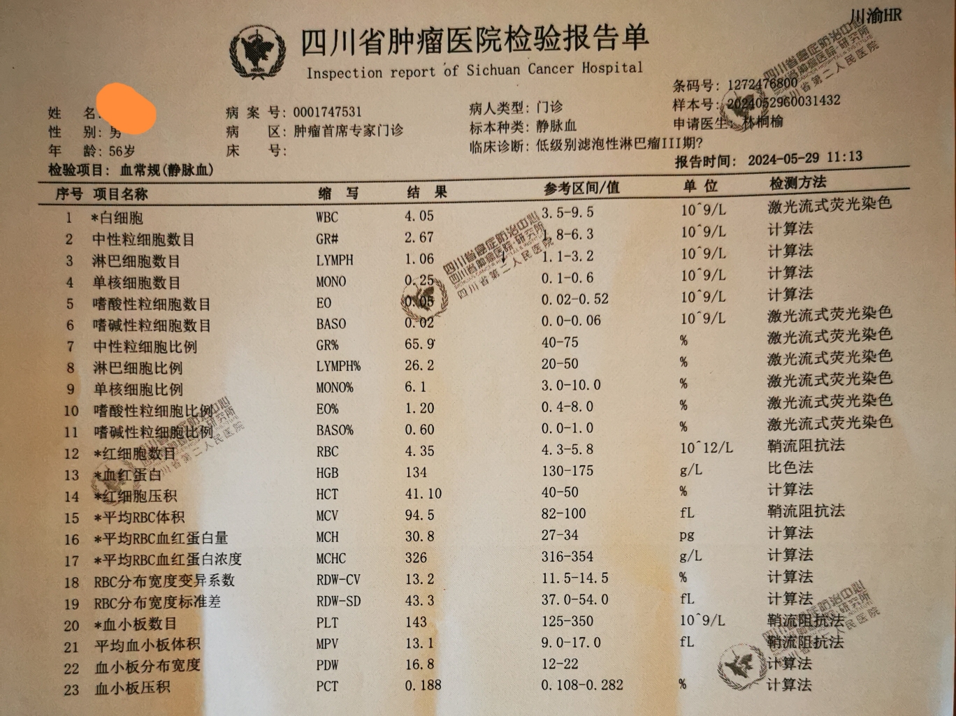 至少3期了,骨穿还没做,也许4期了。治愈是不可能的。还是想先观察一下。有乏力,腹痛症状,偶尔轻度盗汗,不太严重。1月12日颔下淋巴结短径0.7厘米,5月6日短径长到1厘米,手术活检查出低级别滤泡淋巴瘤,ki67 30%左右,不知这条是否符合肿瘤进展治疗指征?