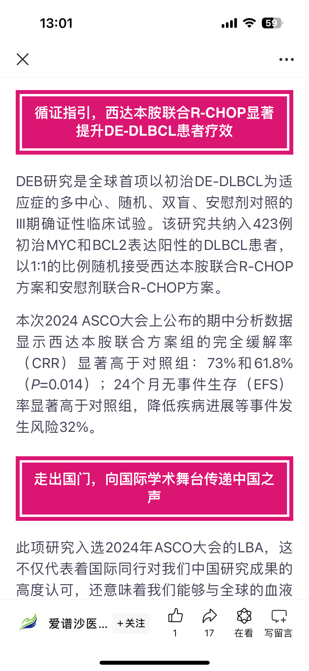 根据瑞金医院赵维莅今年刚发布的研究,双表达用R-Chop+西达本胺相比只用R-Chop可以提高10%的CR率。而用Pola-R-Chp方案治疗双表达患者相比只用R-Chop可以提高10%左右的无进展生存率PFS。两相比较下来,双表达用R-Chop方案联合西达本胺的治疗费用少多了,如果经济压力大可以考虑这个方案。而且西达本胺可以想办法找病友吃剩下的一半都可以很便宜买到。个人意见仅供参考。