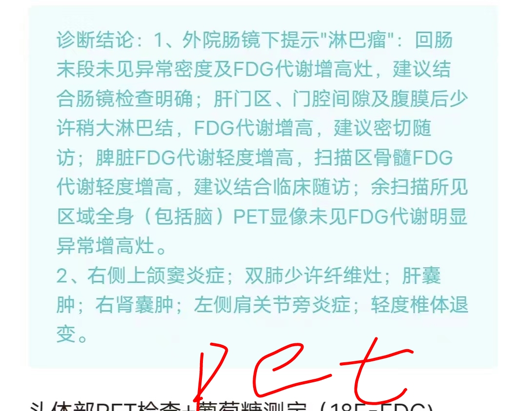 平淡123 发表于 2024-07-17 20:42 我看到篇文章,说双打击,也有可能是非双表达,我感觉瑞金专家的考虑应该有自己的理由,只是不知道基于什么 我是题主文中的患者,是她老公,我的困惑主要在于,我身体没有任何不适,我在浙一做了派特,也都正常(如题主图),唯一就是肝门附近有少量稍大淋巴suv有点增高,当时浙一医生都说这里不认为是侵袭。甚至,派特说,原病灶那里(回肠末端)没有发现异常。 明天约了浙一消化科,复查肠镜,再做活检。