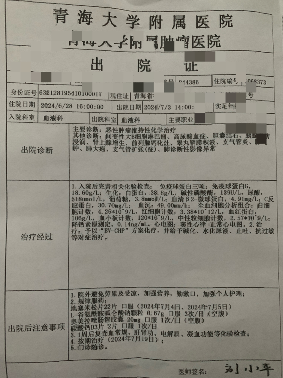 求助:各位大神、各位战友、各位家属大家好,今年五月底我父亲(70岁)在青海确诊为非霍奇金间变大细胞淋巴瘤,cd30+、alk+,于是六月初前往北京进行治疗,首疗很顺利,效果也很好,我父亲纵隔侵犯导致的疼痛消失、颈部肿块也很快消下去了,于是首疗结束就出院回老家了。