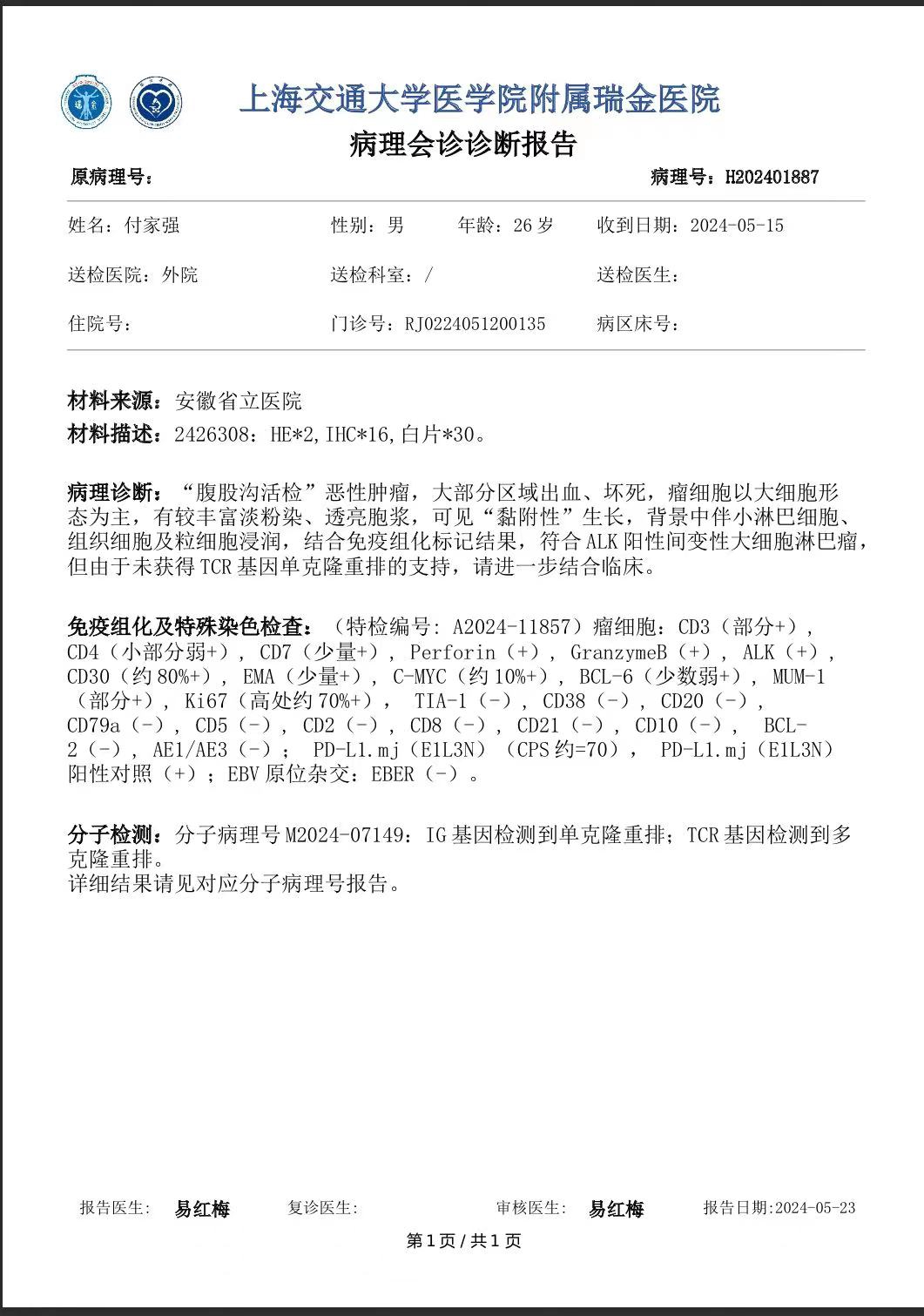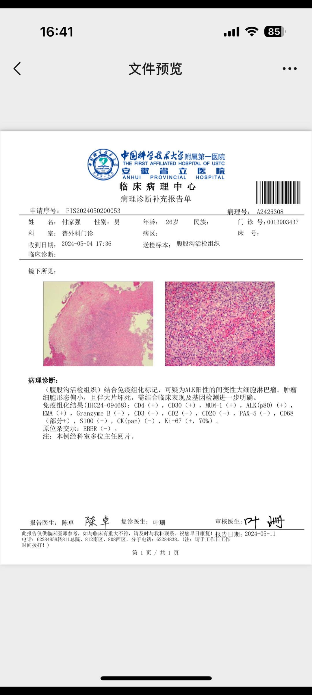 4月22日,经安徽省立医院治疗,被当脓肿切排引流,后一周左右一直不愈合,伤口处组织发黑。于5月1日取伤口内坏死组织做了病理,病理未见异常,后加做免疫组化两次,最终怀疑是ALK+间变大细胞淋巴瘤(除了伤口不愈合,没有其他症状)
