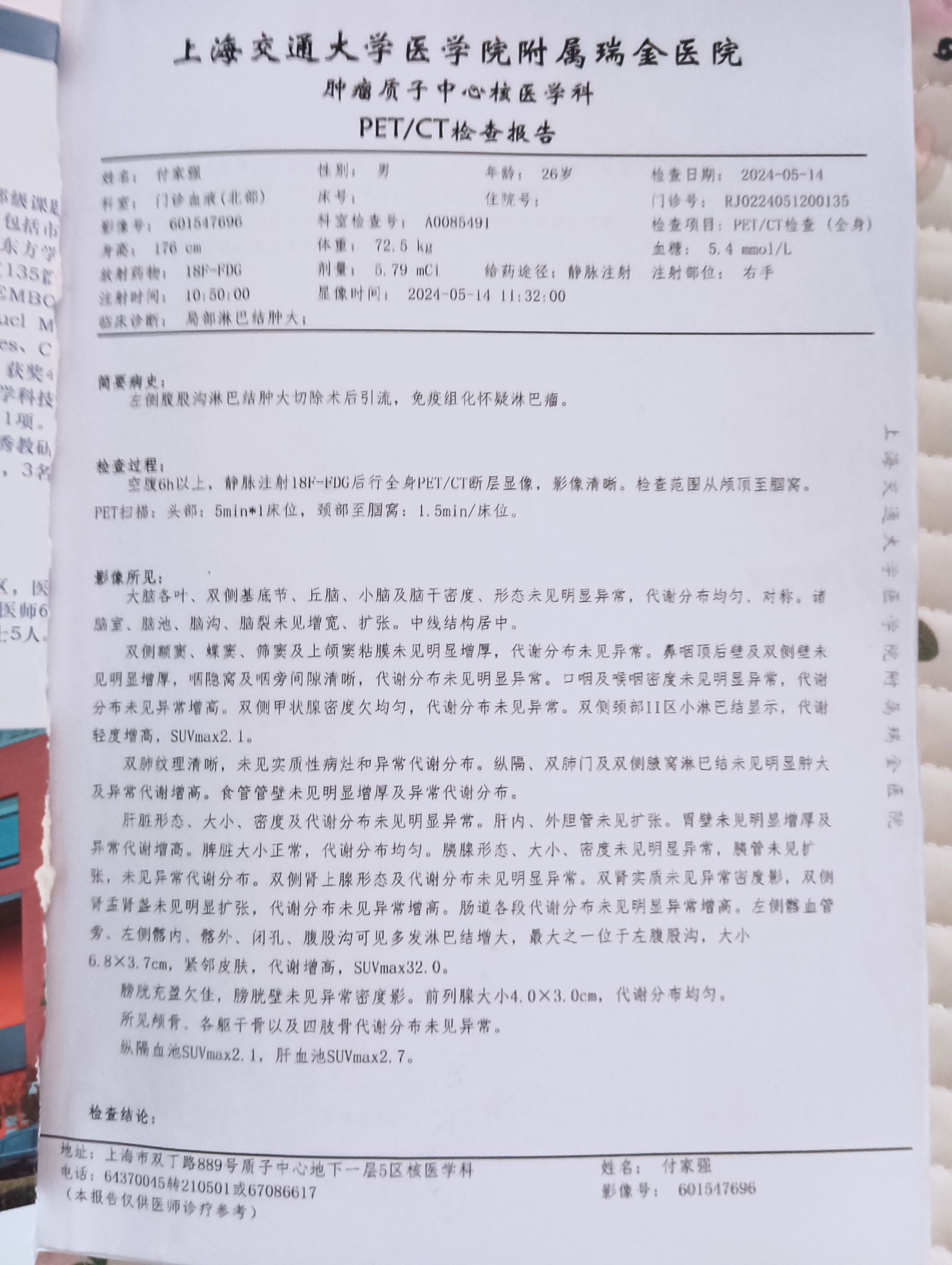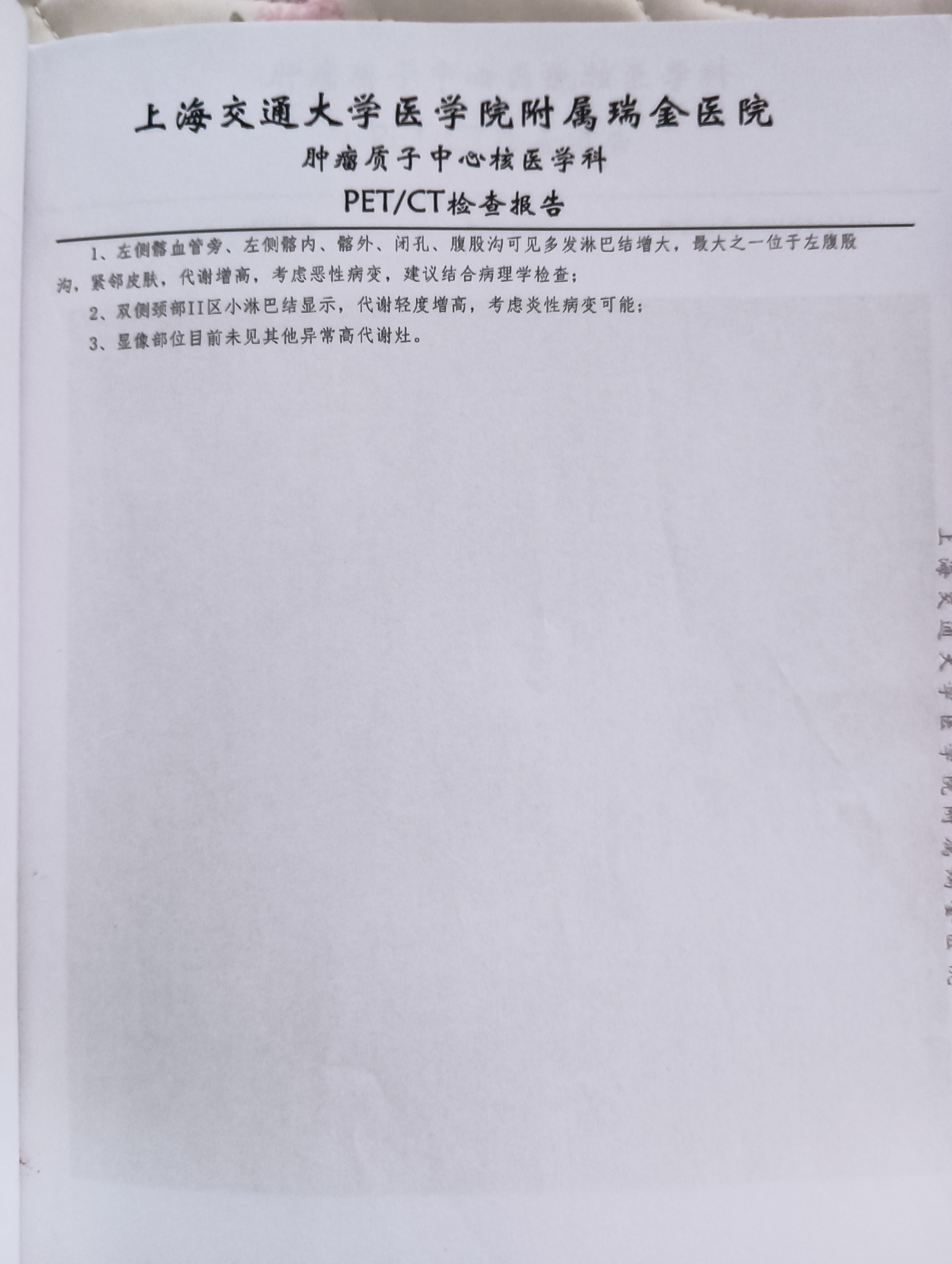 5月13日至上海挂专家号问诊,同时做了pet ct,显示左腹股沟处恶性病变(因为手术原因不方便行走,家人驱车带我来的上海,后来可能是路途太远颠簸的,伤口持续肿大,现在想想都后怕)