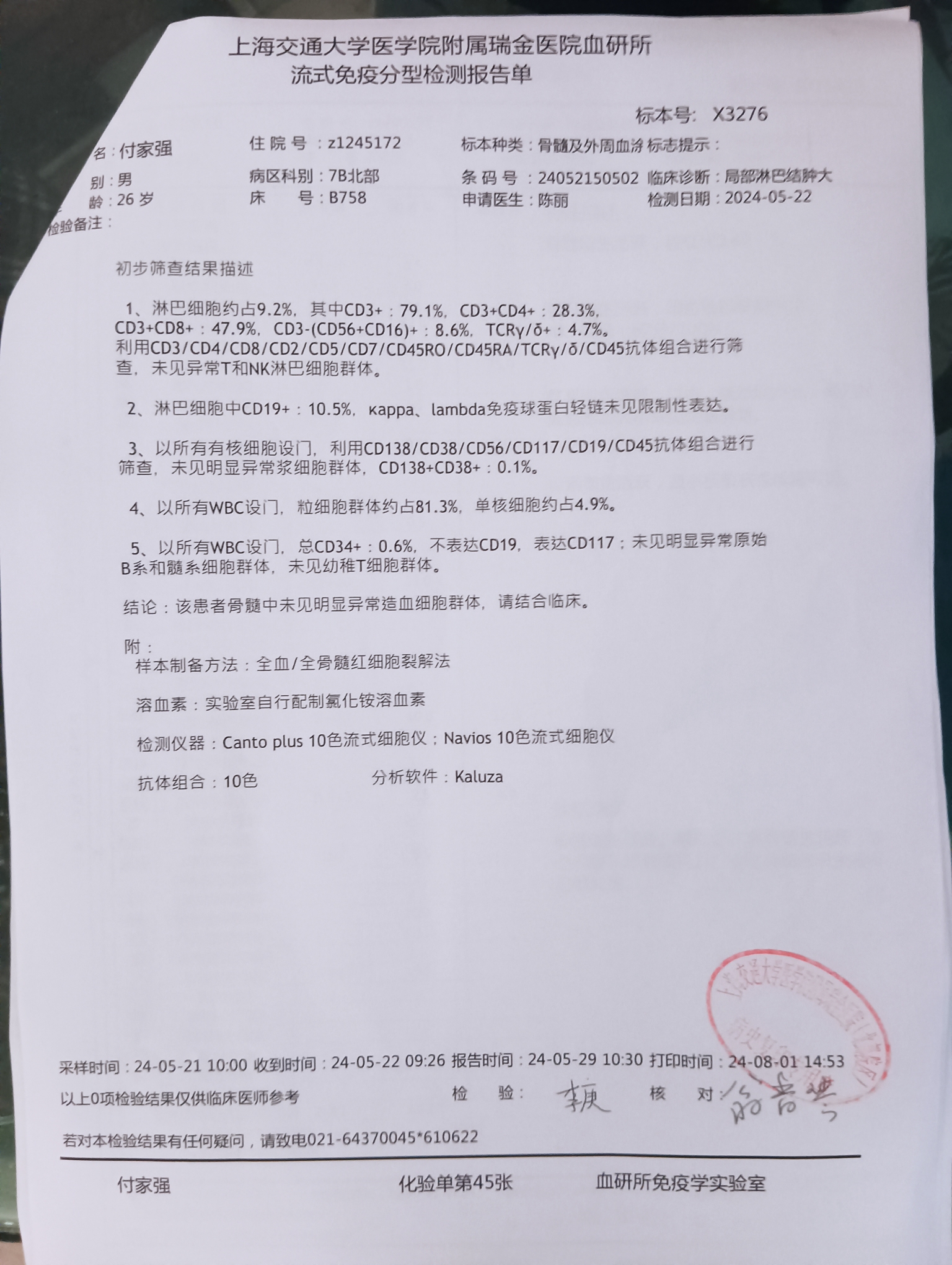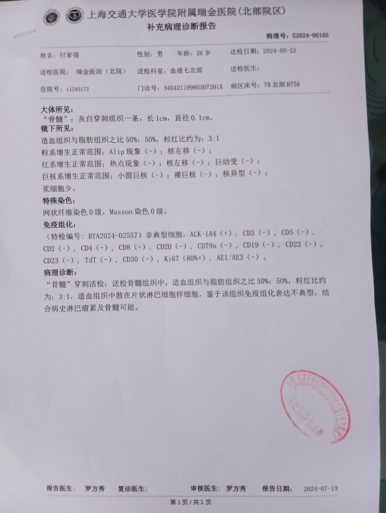 于上海重新做的免疫组化,也符合ALK+间变大细胞淋巴瘤(好像TCR基因重排对不上,但是临床症状都符合),于5月22日上了第一次化疗(腿伤严重实在等不了了),化疗后效果立杆见影,肿块变软及消失,目前三疗已经结束了,伤口还有一点,就快愈合了。