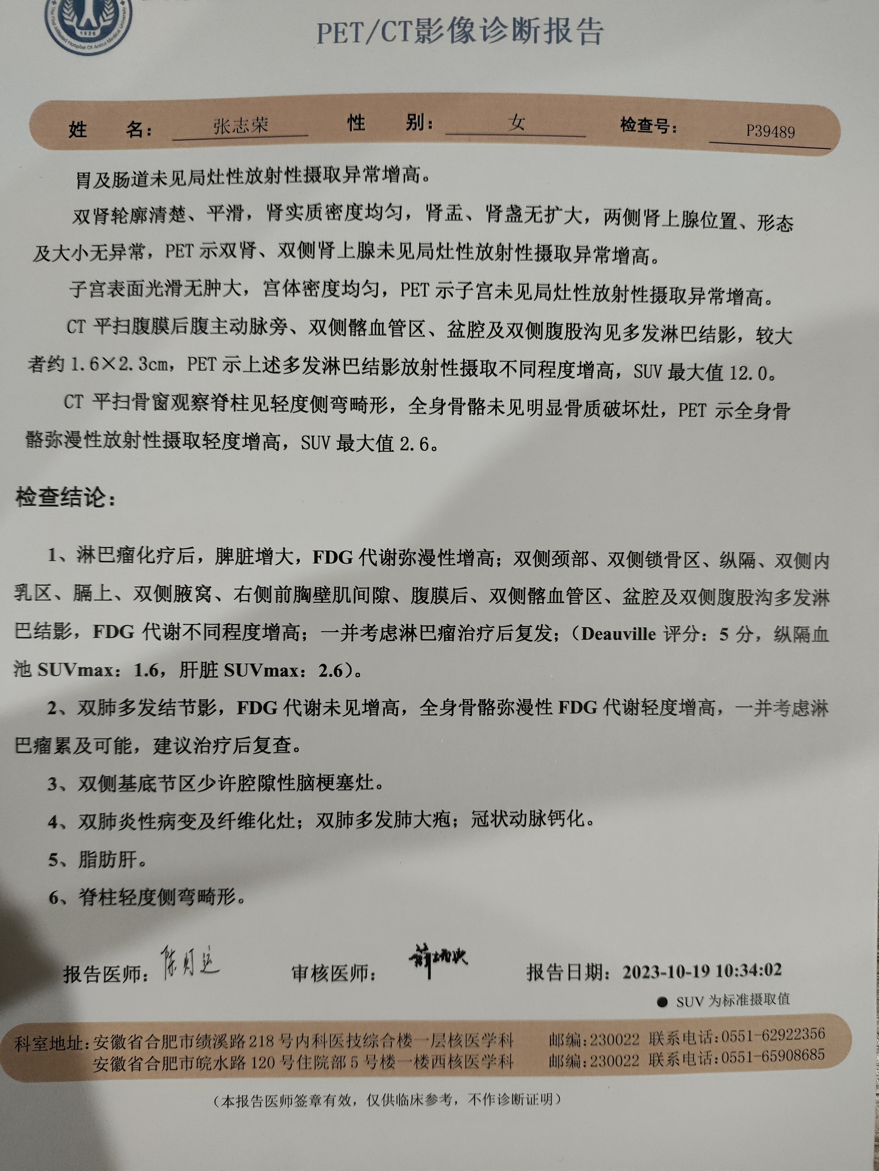 ,2022年春天我三姨检查出淋巴瘤,化疗六期之后,做了一次pet-ct,说可能是复发了,因为化疗后身体有些吃不消,就没有继续治疗,但是状态还可以,就没有治疗,一直到2024年7月开始发烧,脾大 ,目前状态不是很好,严重贫血,反复发烧,接下来该怎么治疗啊(下图是2023年10月做的pet检测结果看不懂)