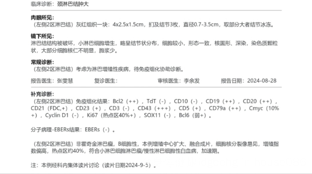 8.23号在广东省人民医院做了淋巴结清扫术 和各类检查,最终病理和免疫组化9.6号出来了 显示是小淋巴细胞淋巴瘤/慢性淋巴细胞性白血病,加速期。