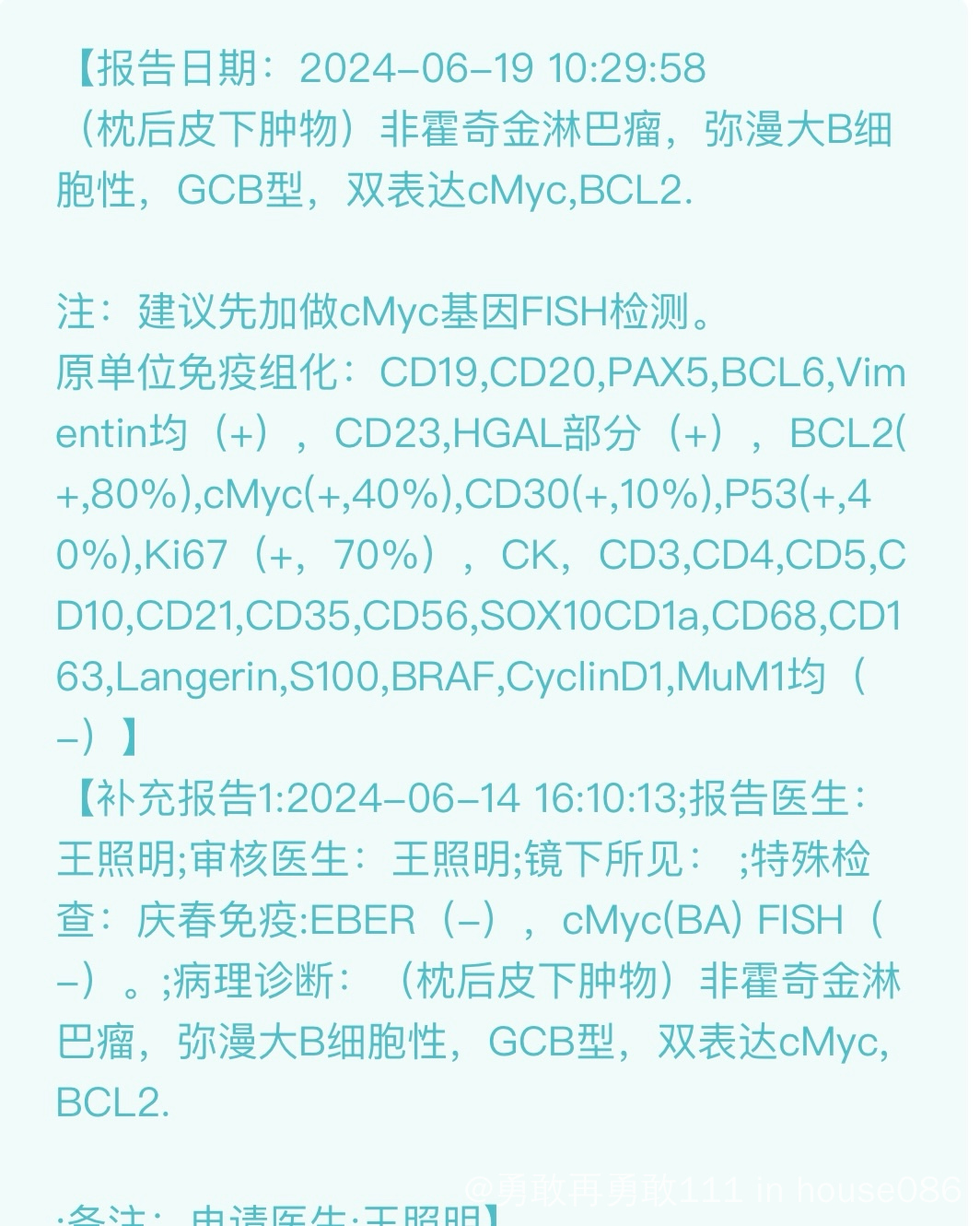 枕后皮下肿物免疫组化:CD19,CD20,PAX5,BCL6,Vimentin均(+),CD23,HGAL部分(+),BCL2(+,80%),сМус(+,40%),CD30(+,10%),P53(+,40%),Ki67 (+, 70%) , CK, CD3,CD4,CD5,C D10,CD21,CD35,CD56,SOX10CD1a,CD68,CD163,Langerin,S100,BRAF,CyclinD1,MuM1均(-)(附图)