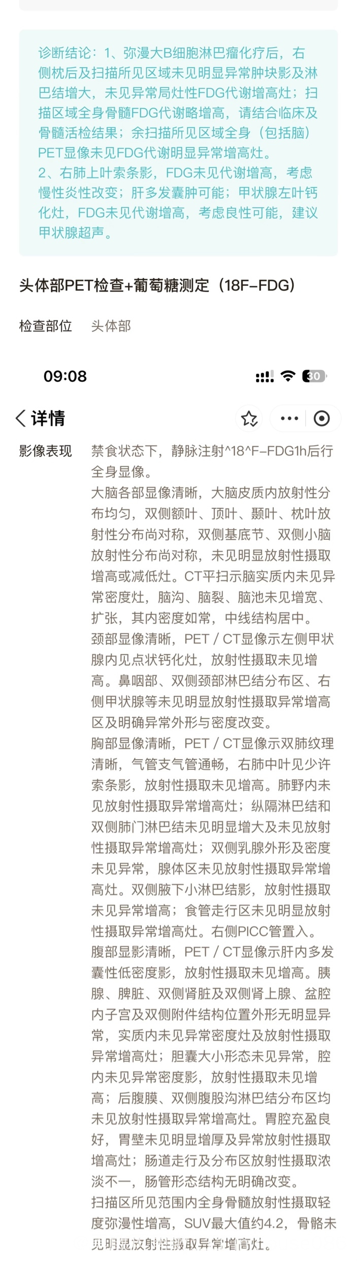 6 月 5 日治疗前petct显示右枕部、右颈部、胰周脾胃间隙、双侧锁骨、双侧腋窝左骼总、左骼外血管旁代谢增高,suvmax最高处26.8,脖子最大处2*2cm 。二疗后 b 超均已探及不到。