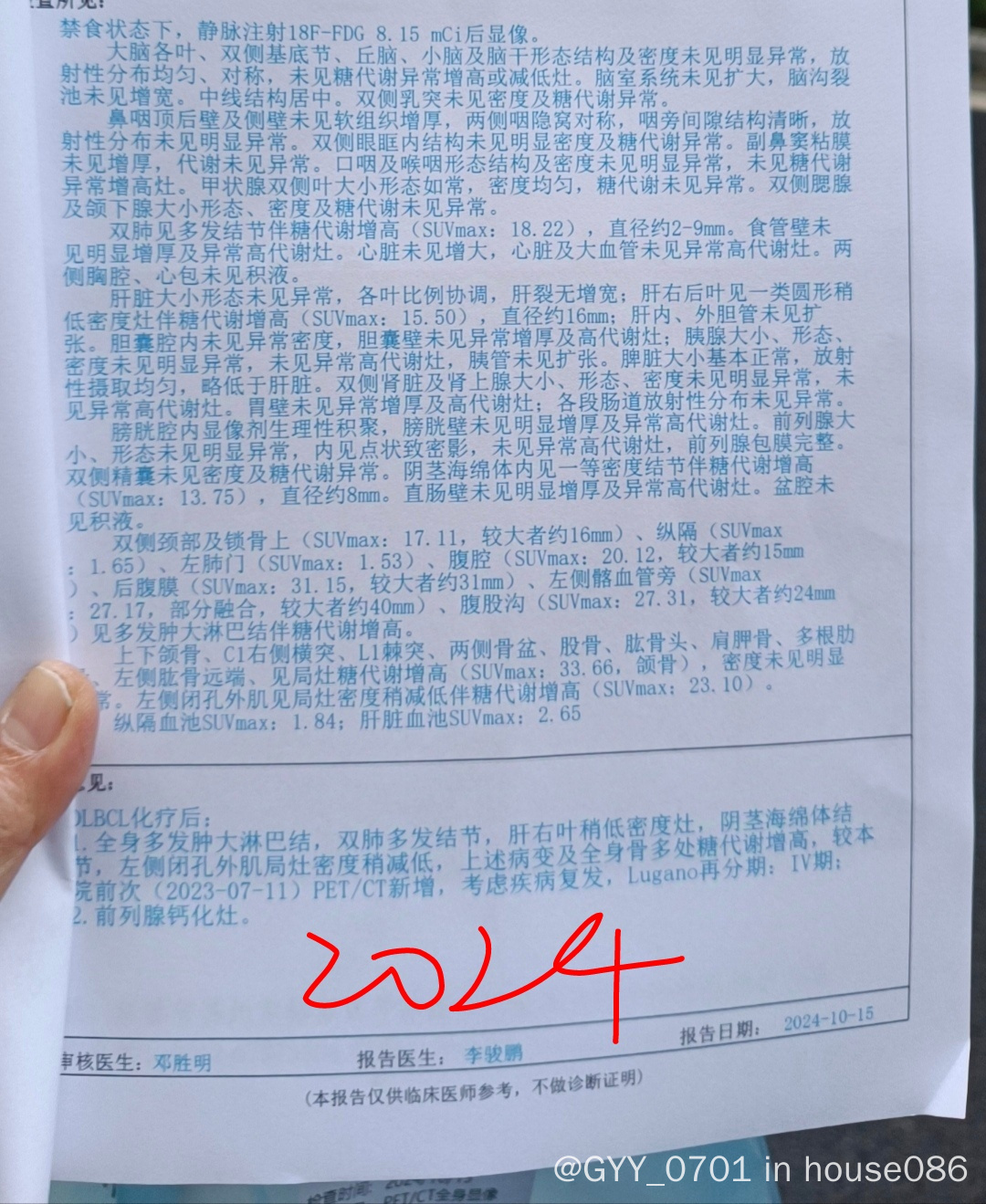 治疗历史:弥漫大b,mcd型。2023.4开始6次rchop+2r,三疗后petCT中期评估cr,10.20结疗后petct cr。