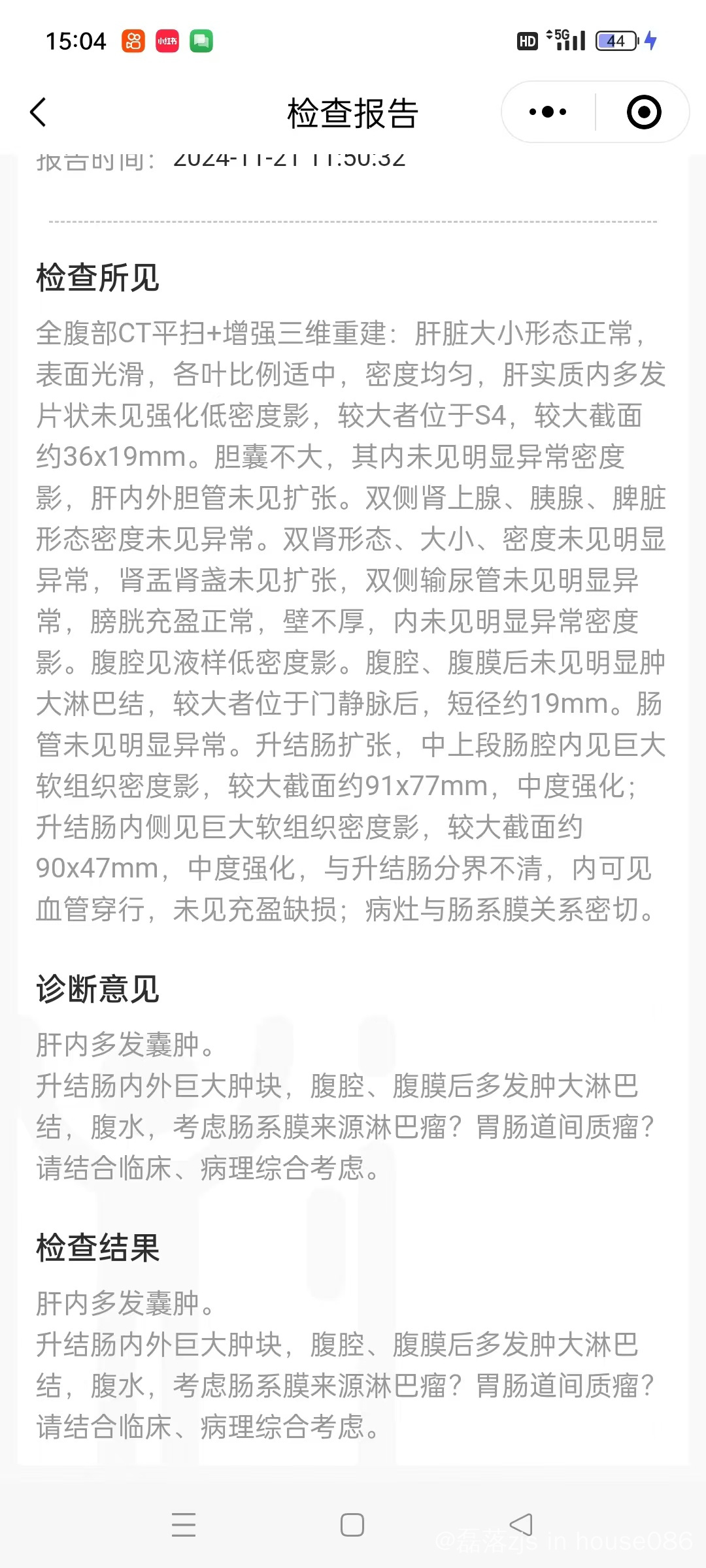 然后入住呼吸科检查之后,ct发现肠道有一个巨大肿物,同时做胸腔镜取活检发现b淋巴细胞增生,大便常规显示有隐血。