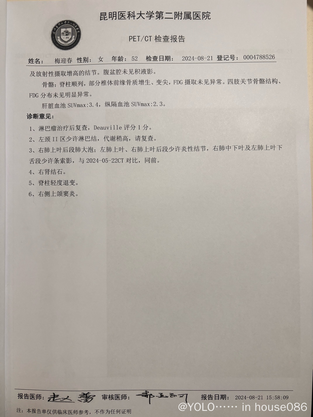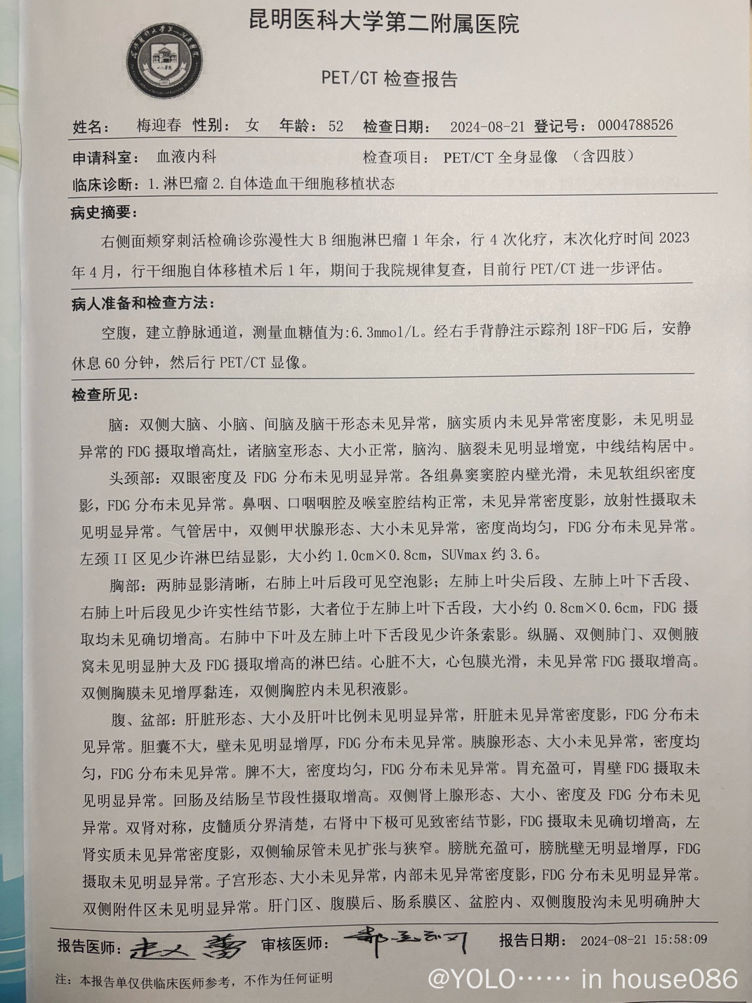 2023年2月(右侧耳前淋巴结穿刺活检)诊断为弥漫性大B细胞淋巴瘤(non-GCB亚型)II期B组、IPI评分1分,采用RCDOP方案化疗,于2023年4月结束4次化疗。2023年5月进行干细胞自体移植手术,2024年8月PET/CT复查Deauville评分1分。