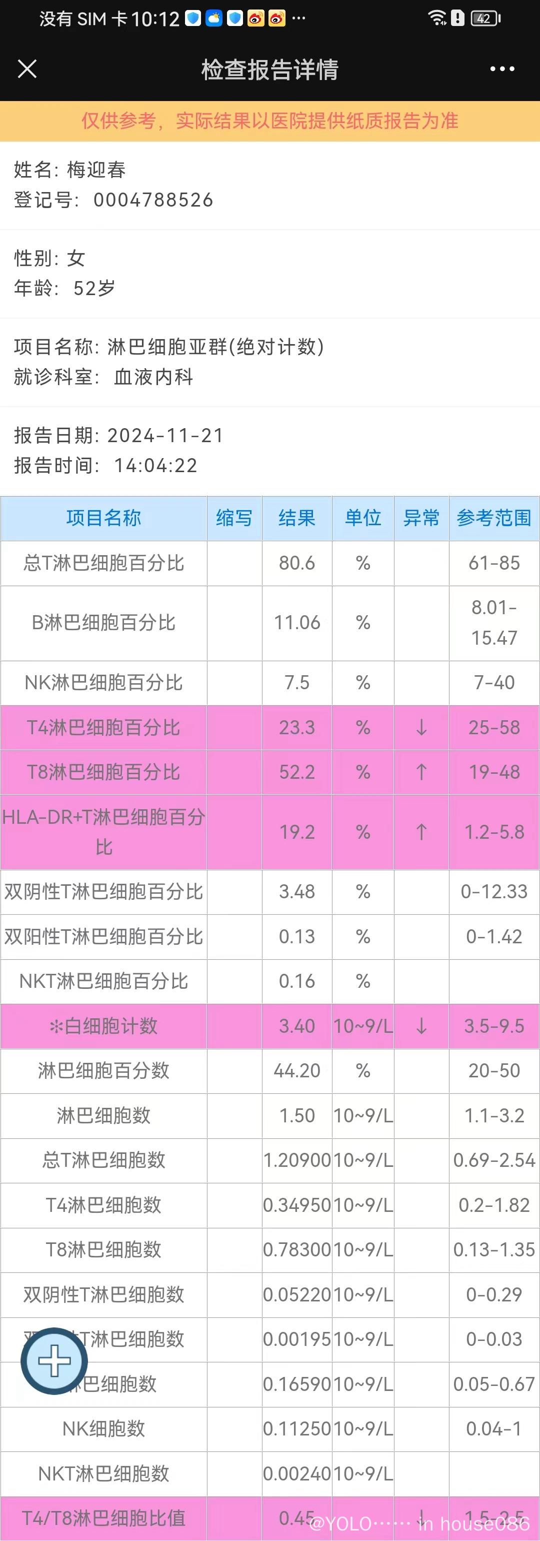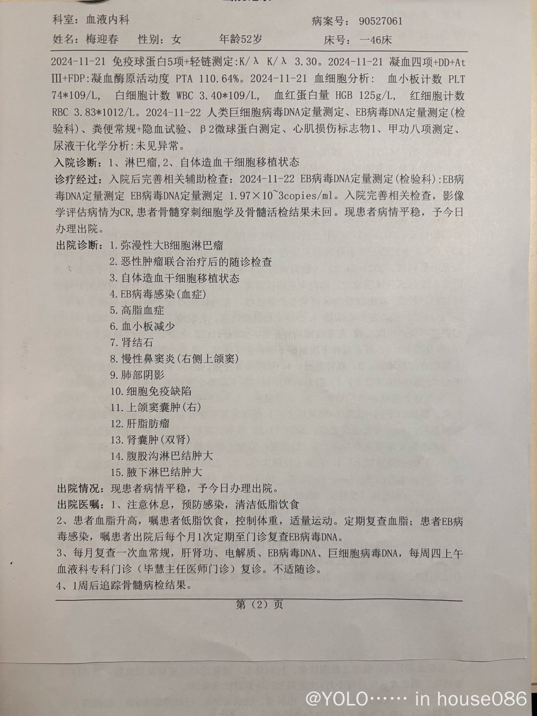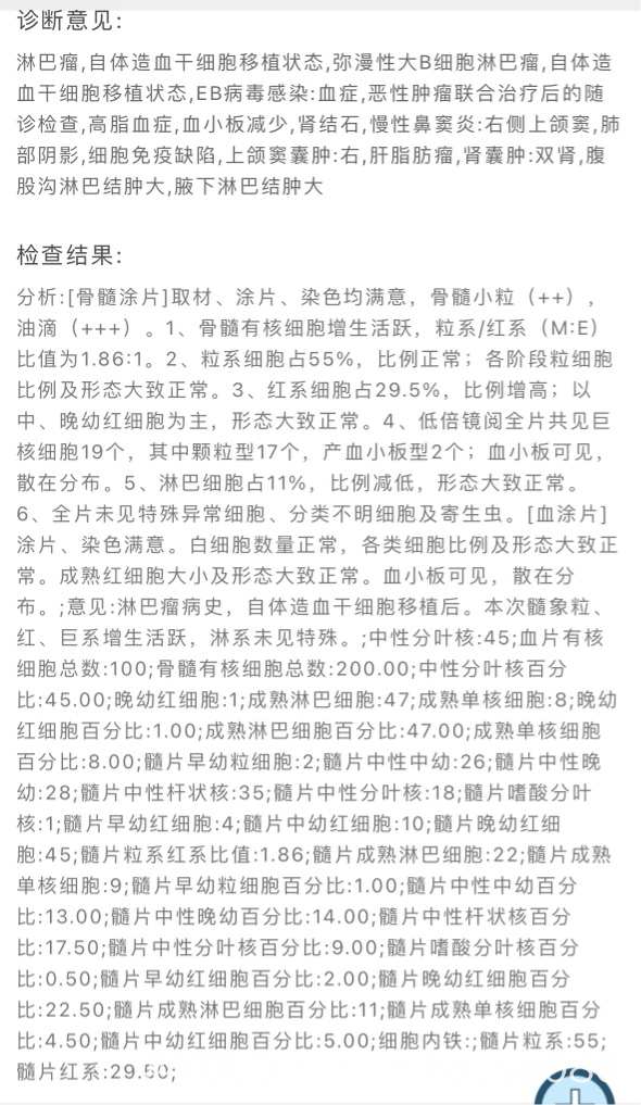2024年11月(移植后18个月返院复查)双颈侧II、III、IV(最大1.4cm*0.4cm),双侧腋窝(左侧2.7cm*1.0cm,右侧2.2cm*0.6cm),双侧腹股沟可见多个淋巴节结构未见异常,(左侧2.3cm*0.8cm,右侧2.4cm*0.8cm)。血小板74*10~9L,EB病毒感染1.97*10e3(2024年5月份第一次感染EB病毒8.54*10e3,),白细胞低3.4*10~9L。