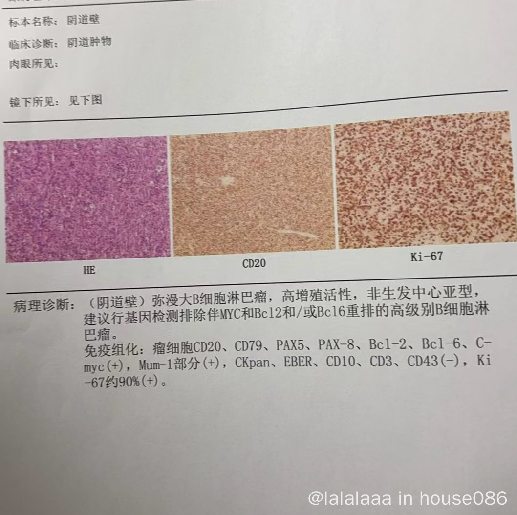 求大神帮看看这个,家里人宫颈阴道处有个肿物,前面一直被误诊妇科肿瘤,后来病理结果弥漫大b淋巴瘤,这个大概是什么程度的呢?化疗该用哪个方案?
