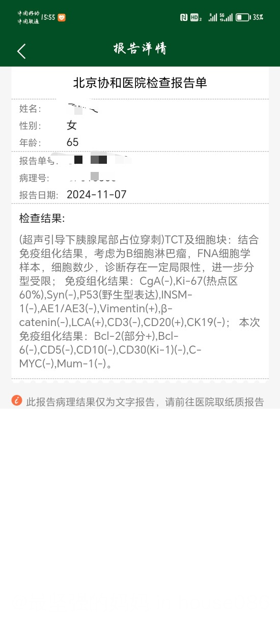 妈妈八月份因上腹疼痛就诊于北京协和医院,坎坎坷可的3个月反复检查住院,经历了两次细针穿刺活检终于定下来是B细胞淋巴瘤,但是由于细针穿刺细胞有限,导致继续分型受限,肿瘤已经从刚发现时的6cm涨到13cm大,11月19号第一个疗考虑肿瘤负荷大只上了chop,而且多柔比星脂质体还因超敏反应换成了吡柔比星,结果肿瘤只缩小了一点点,明天第二个疗上美罗华加chop,但愿能有更好的效果,有病友情况类似吗?大家都几个疗调整用药啊?还请大神帮我看看组化结果真的定不了弥漫大B吗?能定的话利妥昔单抗以及可能用到的pola都是医保报销的啊,提前感谢各位了