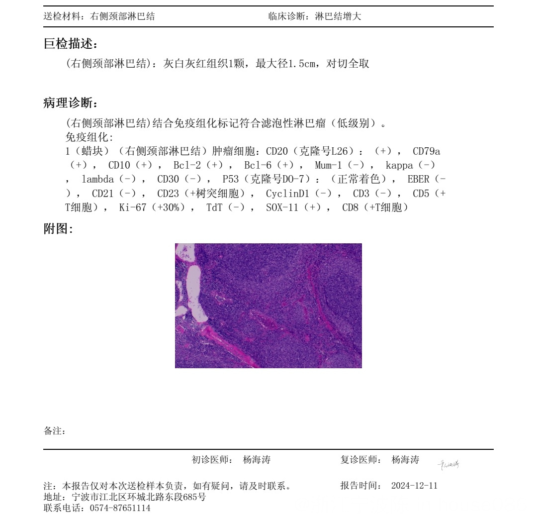 病理报告滤泡性淋巴瘤1-2级