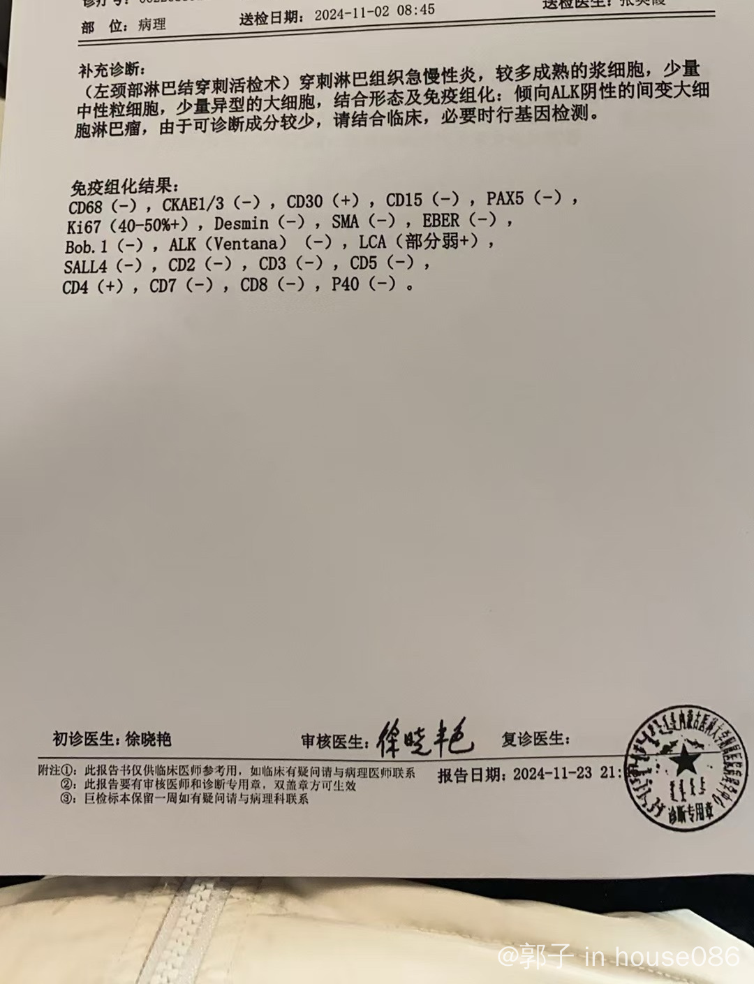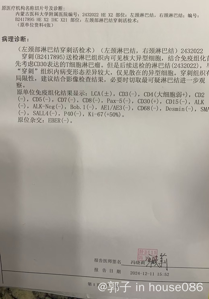 新人,求助!父亲10月15号发现颈部淋巴结肿大,然后输了一周消炎药没有效果,就去呼和浩特附属医院拍了彩超,说边界不清让进一步检查,然后又做了穿刺,穿刺没得出结果让进一步做免疫组化,然后大夫就说穿刺组织少,建议取下来淋巴结化验,后来就住院左右颈部各取了一个淋巴结,取下来病理科说淋巴结中异性细胞少,让用之前的穿刺做免疫组化,然后就用穿刺组织做了免疫组化,相当于白白开了俩刀取了俩个淋巴结。免疫组化出来说,倾向于ALK阴性间变大细胞淋巴瘤,让进一步做基因检测。后来不放心就挂了中国医学科肿瘤的号,拿了病理切片进行专家会诊,当时就认为是淋巴瘤了,也一并给预约了PET/CT,现在专家会诊结果出来了,还是穿刺免疫组化考虑T细胞淋巴瘤,但是因为淋巴结中没有符合淋巴瘤的细胞,所以建议再取一个可疑的淋巴结化验,PET/CT结果还没出来呢。突然迷茫了,历经俩个月,没有确诊病因,想要寻求些建议。