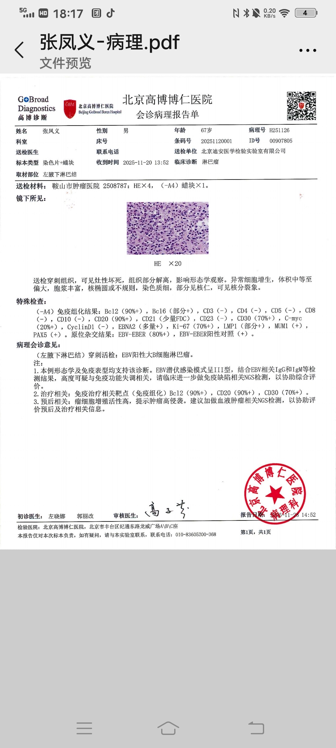 我老公去年确诊NKtⅣ期B组经过八次化疗后今年8月6号Pet完全缓解,后面用pdl十西达维持了2次10月12号发烧14号查血EB阴性,22号复查EB阳性但没发烧,1870.顺便骨穿有百分之五不典型淋巴细胞怀疑复发,24号腰穿好的,并且流式出来高度怀疑复发,25号再次查血EB2378并骨穿十活检,但骨穿EBER阴性,可活检有部分嗜血细胞,29号查血EB转阴马上第二次化疗依托泊苷十培门冬控制嗜,停掉西达十戈利昔替尼发烧期间吃了西达十戈利昔替尼,医生建议异体移植,请问在经济有限的情况下有好的医院和方案吗?目前在杭州半山肿瘤医院,他们只做自体移植让我们咨询浙一 |