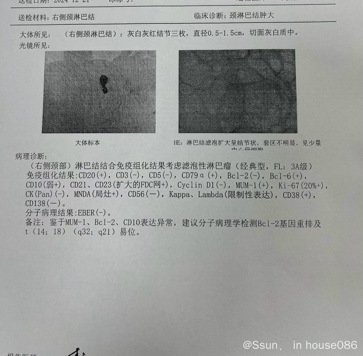 最好还是做一下病理会诊,因为这份病理报告写的有点问题,CD10弱+在3A级滤泡中并不罕见,MUM-1+也不算是异常表达,只有Bcl-2-在滤泡中比较罕见,分子学检查Bcl-2基因和t(14;18)易位其实是一回事,不知道为什么还写成“及”,如果确定是经典型滤泡而且分期是局限期的话,优先选择的治疗手段应该是放疗,不是化疗,不需要R-CHOP方案。 |
