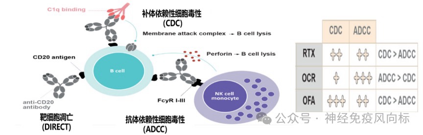 抗CD20单抗介导B细胞清除依赖于三类核心机制:诱导靶细胞凋亡、补体依赖性细胞毒性(CDC)和抗体依赖性细胞毒性(ADCC)。值得注意的是,不同抗CD20单抗在这三种机制中的作用存在显著差异,(图2)。