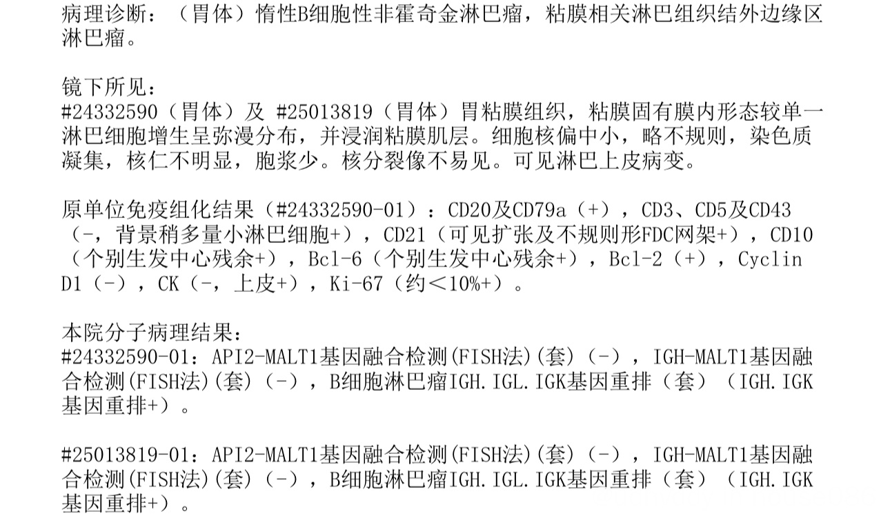 病理会诊结果诊断为惰性b细胞性非霍奇金淋巴瘤,粘模相关淋巴组织结外边缘区淋巴瘤。前段时间HP阳性,已做抗Hp治疗。接下来准备做pet。