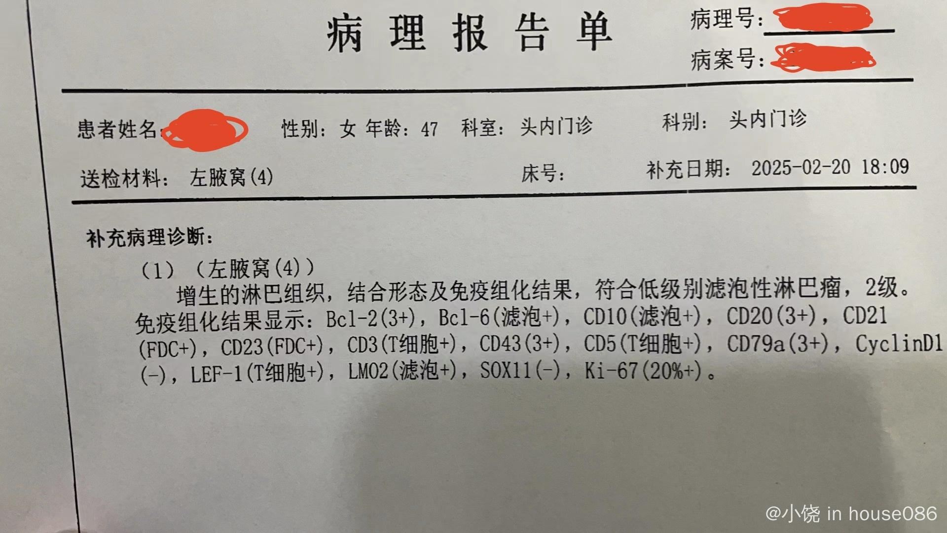 戍望 发表于 2025-02-25 10:29 低级滤泡,治愈率很高的。换一家医院拿蜡块或切片在复核一下病理,一定要两家医院病理一至在制定治疗方案。