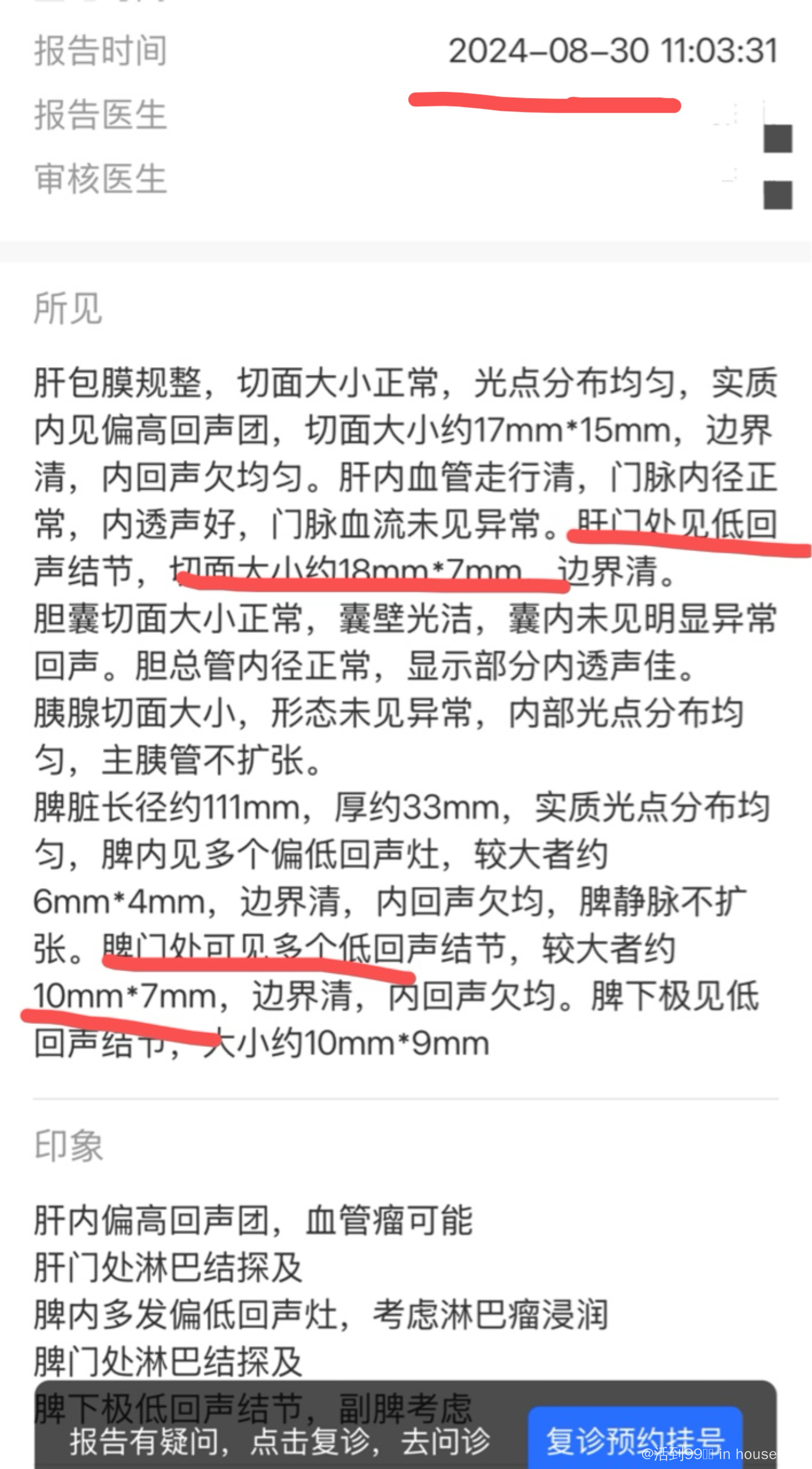 超声检查在浅表软组织效果显示好,对深部超声有些限度,因为超声设备清晰度,病人胖瘦,超声检查医生水平不同,结果也不同,超声检查只能做参考不能做诊断,只有强化CT检查PET~CT检查,磁共振检查有诊断价值,至于肝门及脾门的淋巴结可能很小不要过于操心,病情稳定就好,如果就是想搞清楚做磁共振检查对软组织看的清楚。