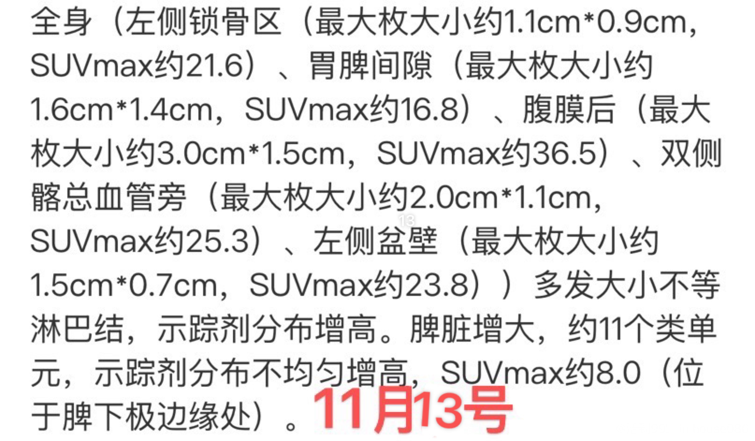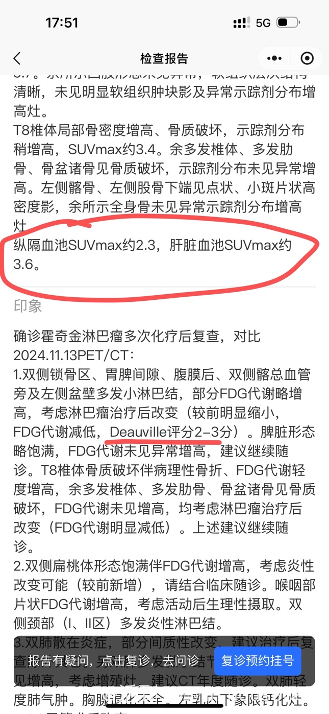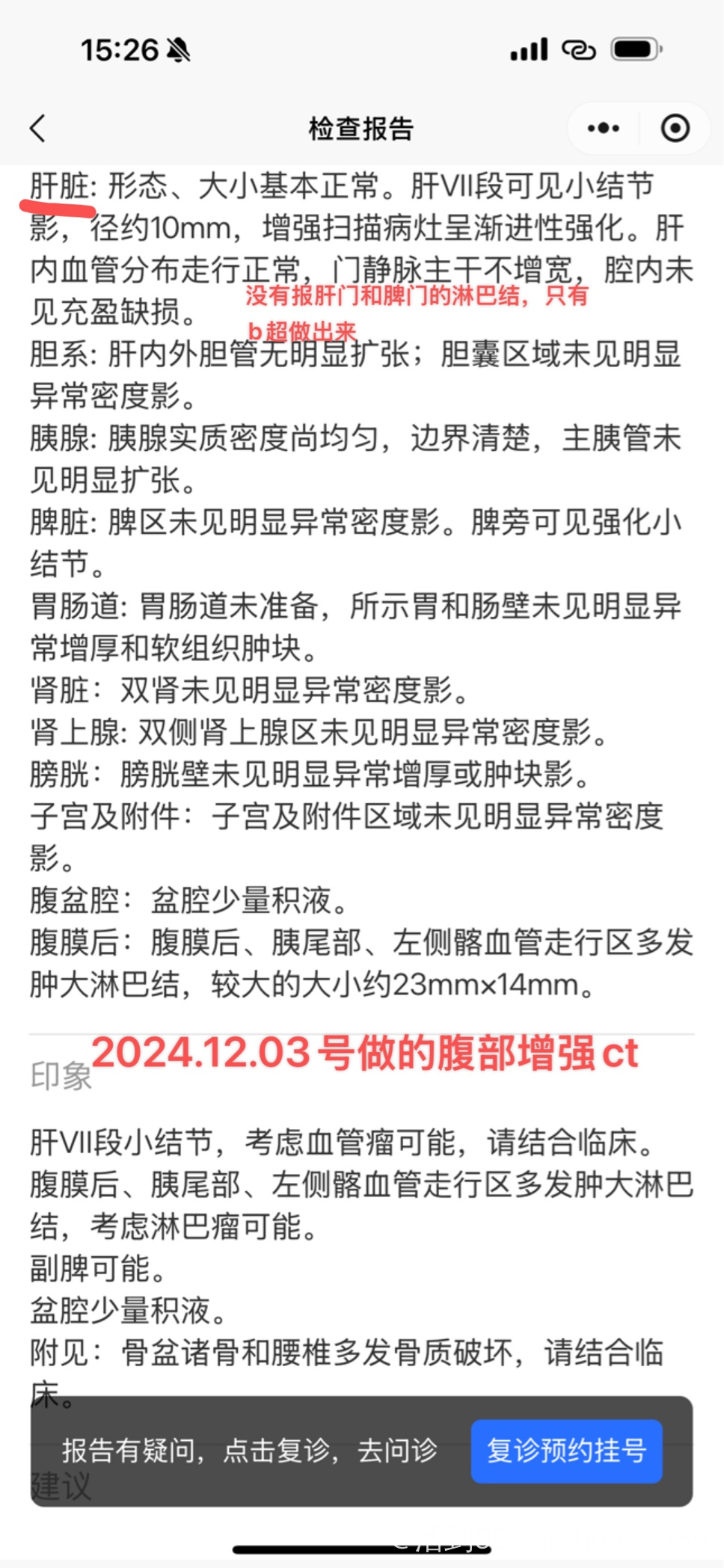 请教大家一个问题,我b超拍出来肝门结节18✖️11mm,脾门10✖️9mm,从去年7月治疗到现在基本没变化,变化不大,后面增强拍ct和pet ct都没看出来,pet和腹部增强ct没报这个肝门和脾门淋巴结,这有啥说法吗???这该怎么办,我是霍奇金4期,初治用的avd2个疗程后又用了abvd1.5个疗程,3.5个疗程后换了二线bv ➕gemox方案用了5次了,2-3分如图三,我是初治,马上就要安排我移植了,我这个肝门的结节没变化怎么办,是不是病理出问题了还是囊肿或者尸体不过它就基本没变化过!治疗期间第二次穿刺了脖子淋巴结依旧是霍奇金~求大神解答,期间第一次做pet那suv值高达20-30是因为我刚做了破腹产手术后15天,可能引起的炎症或者复发难治,所以才换的二线方案,具体是不是复发难治谁也不知道,求大神帮我解答