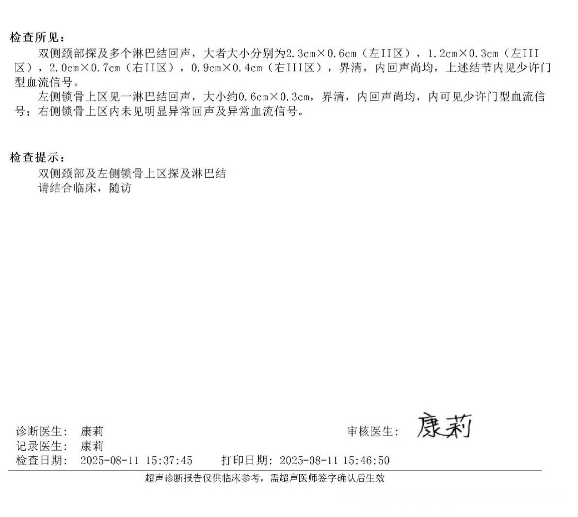 我今年44岁。1月份因为去年单位没组织体检,自己去医院做了个胸CT查出“左锁骨数枚淋巴可见”,医生让做彩超