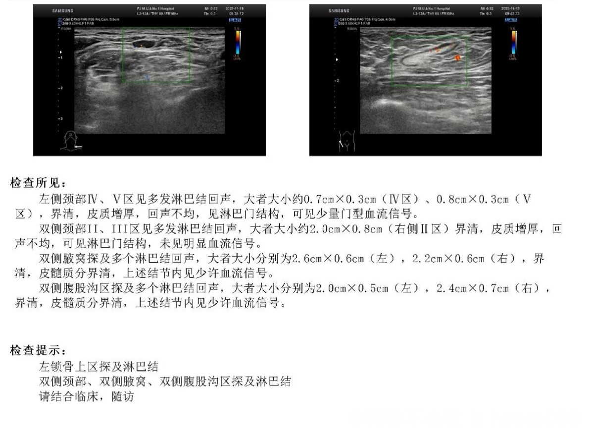 双侧颈部探及多个大小不等的稍低回声结节,大者大小分别为1.52cmx0.42cm(右),2.41cmx0.49cm(左),界清,内回声尚均,上述结节内见少许点状血流信号。双侧腋窝及双侧腹股沟区未探及明显异常肿大淋巴结回声。