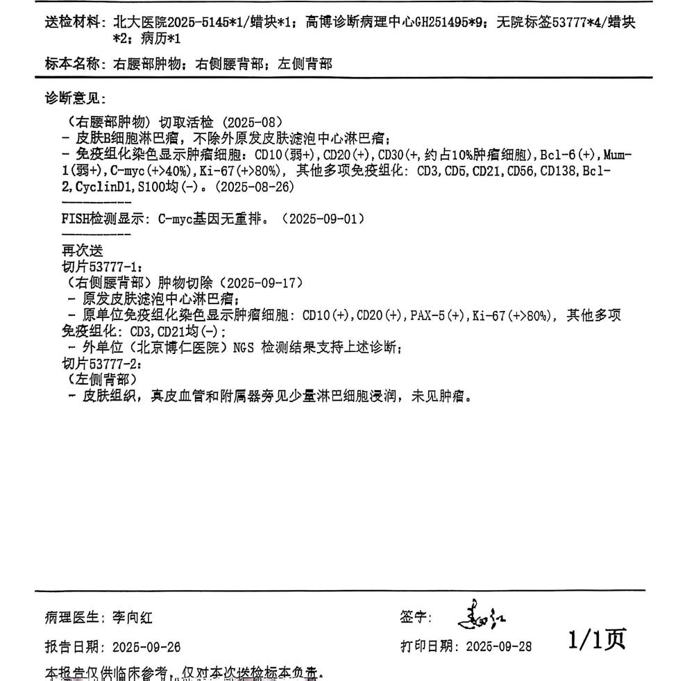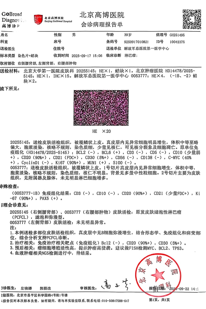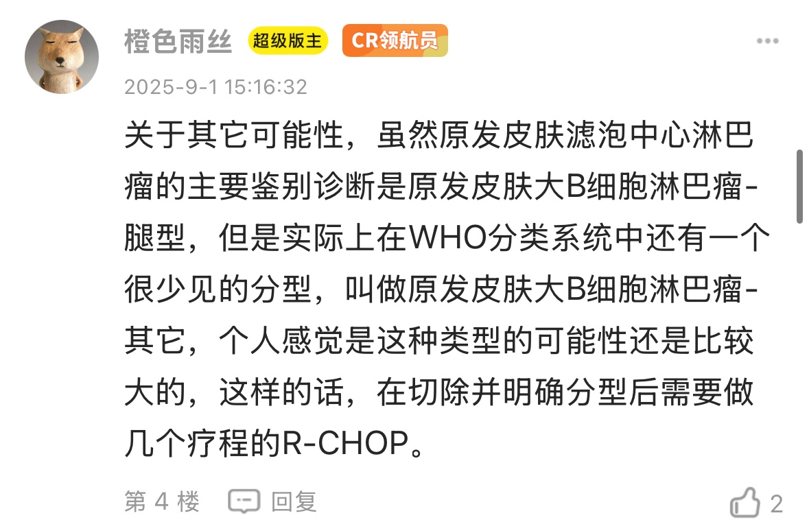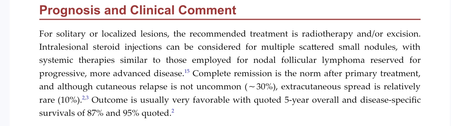 这是ICC分类中对这个类型的描述,大致是说对于孤立病灶建议的治疗手段是放疗或切除,多发的小结节也可以通过局部注射激素治疗,系统性治疗,类似于经典型滤泡的那些治疗手段通常只用于进展的晚期疾病。初治后基本上都可以完全缓解,皮肤复发率大约30%,但只有约10%会散播到皮肤之外,五年总生存率和疾病特异性生存率分别为87%和95%。