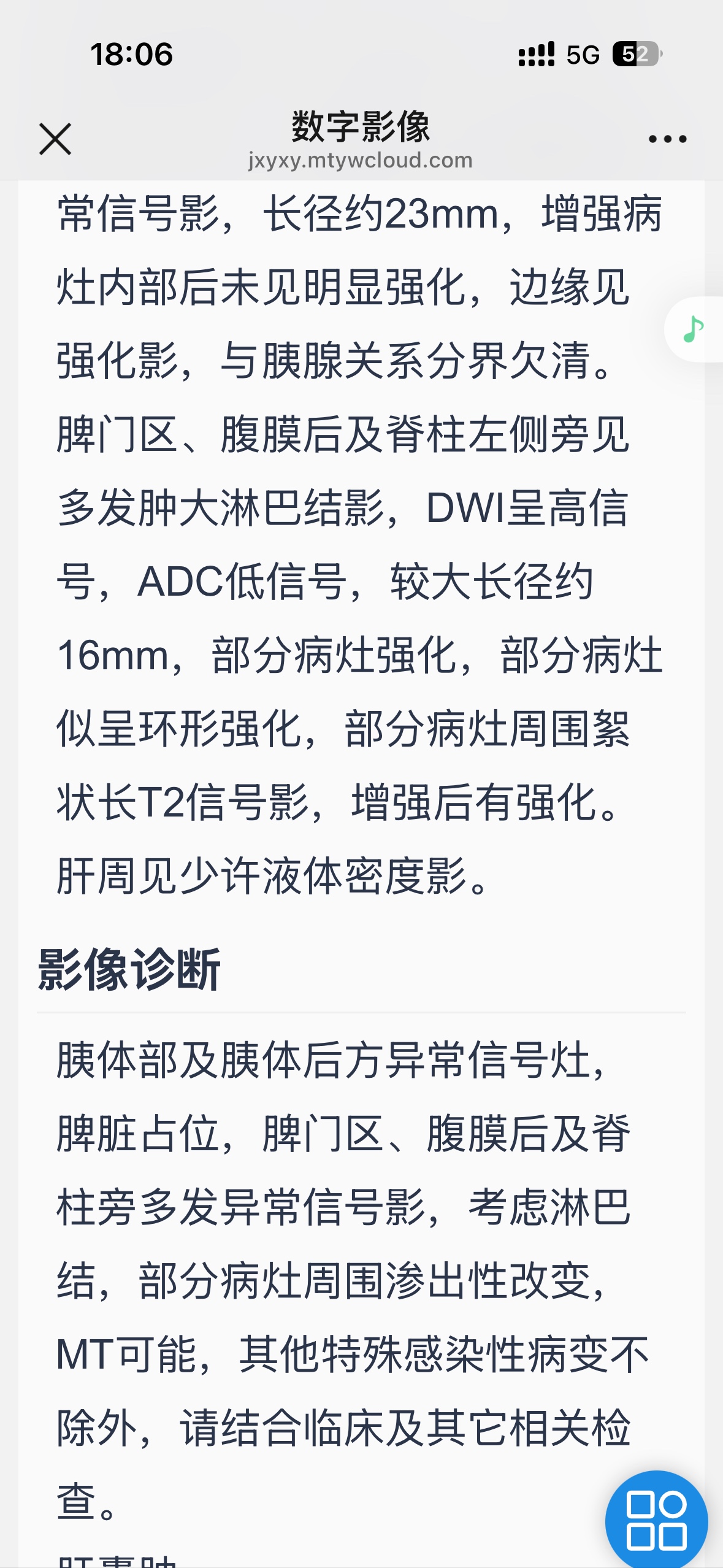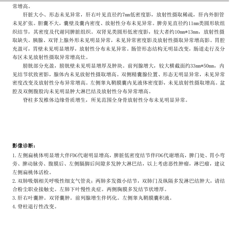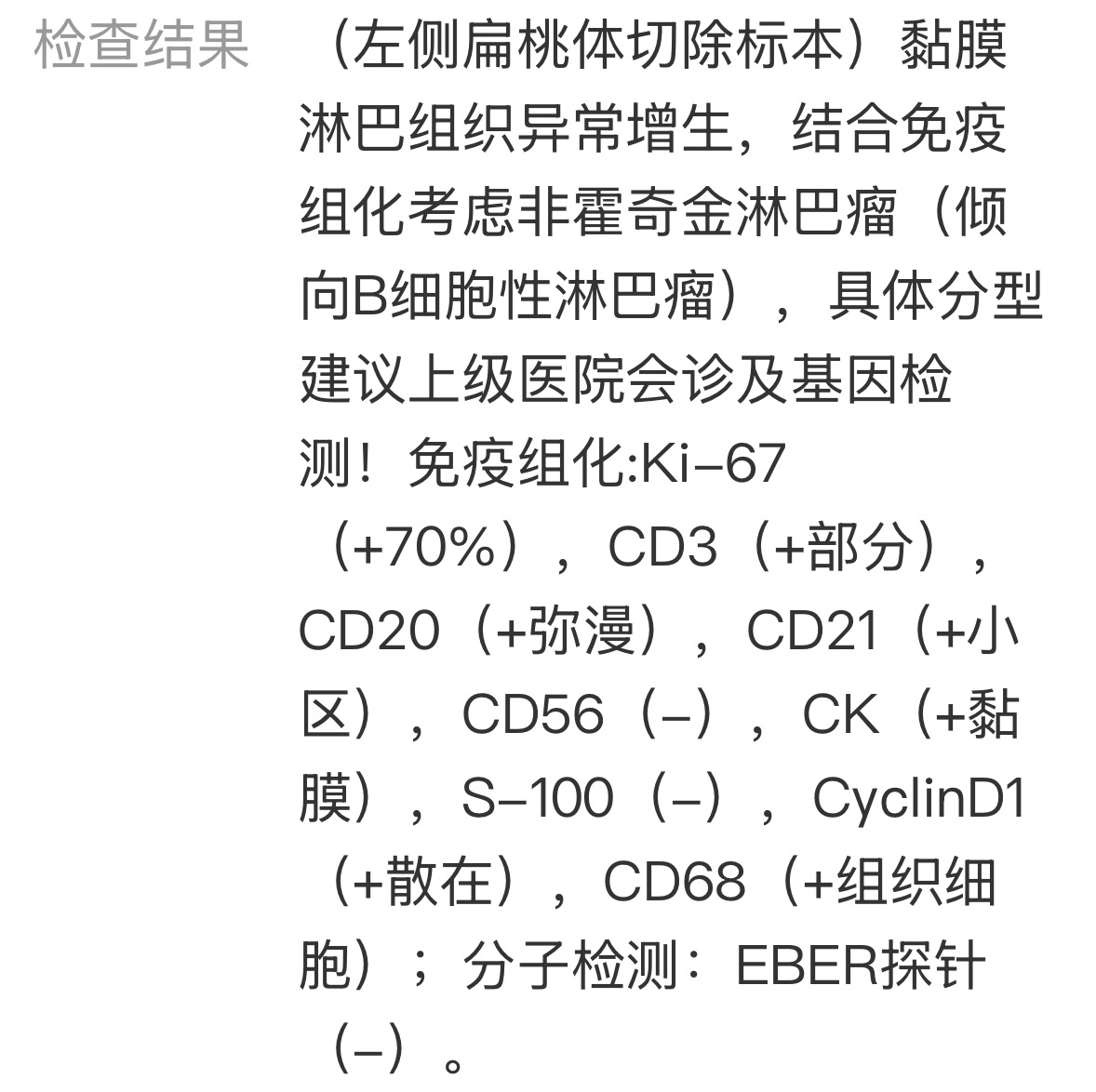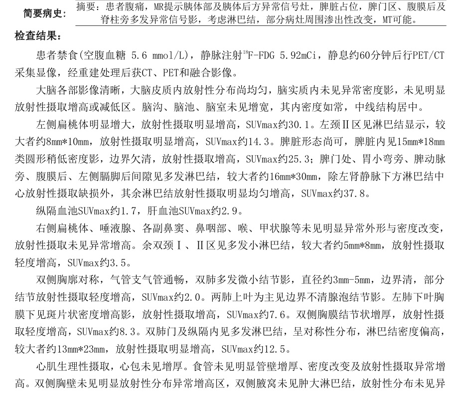 雨丝,您好!抱歉再打扰下您,我再补充一些家属(男,59周岁)的报告。一个是上腹部核磁共振,一个是第一次做的免疫组化,一个是pet ct。麻烦您看看这些报告对后续fish检测和治疗是否有所辅助?家属12月下旬腹痛及后背痛了三天,以为是腹部有问题;后来做了pet ct发现扁桃体suv指数很高,活检就取了扁桃体。麻烦您了!