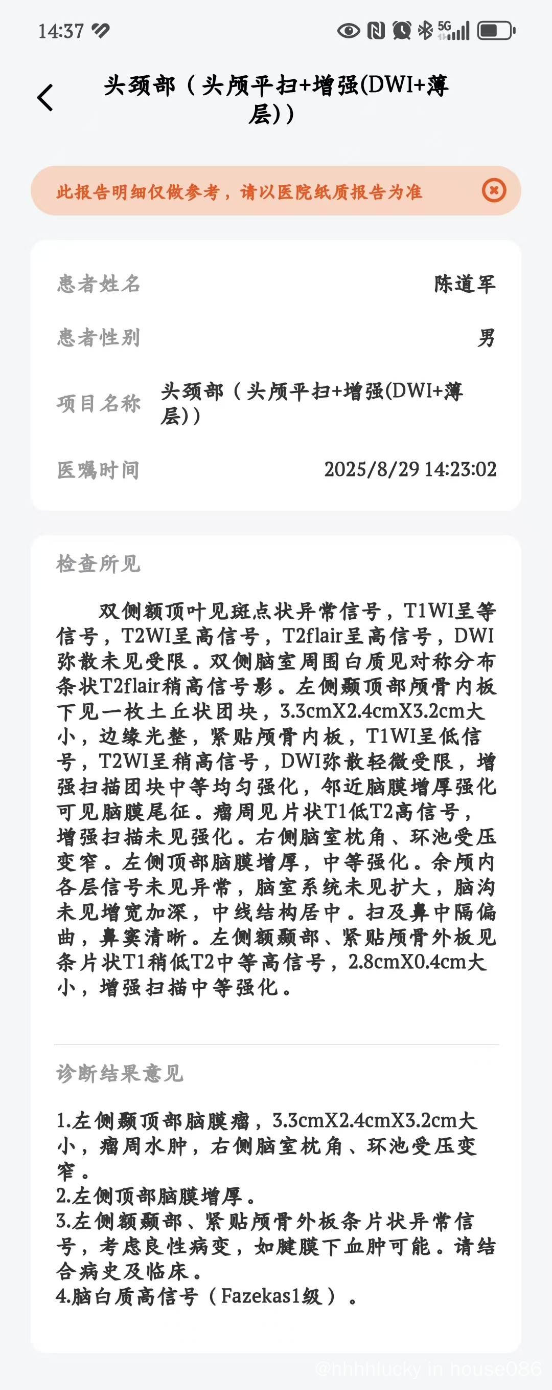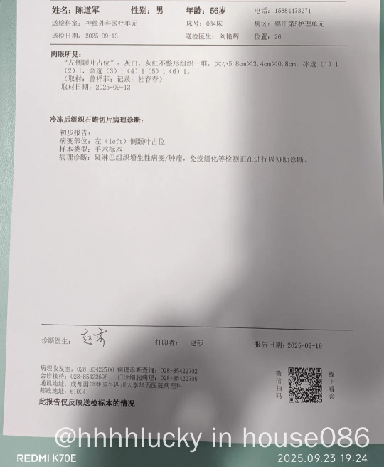 我爸爸在5月30号因为头晕,颈椎疼去医院做ct,当时医生说脑子里有个良性的瘤,7月30号做核磁共振确认是脑膜瘤,需要开颅手术,9月10号我们到华西医院开颅后,术后医生告诉我们这个瘤是来源于淋巴造血系统的肿瘤,下面是核磁共振结果和术后的病理报告,目前正在等免疫组化结果。最后免疫组化结果是什么的可能性较大呢?