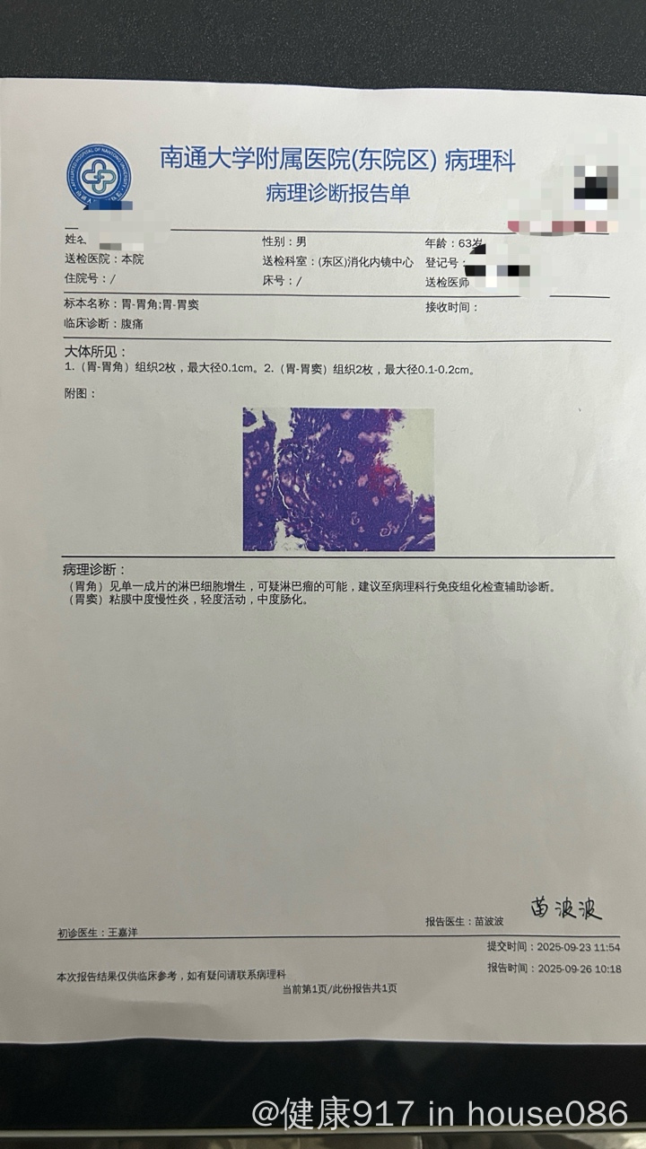 1),拿当地的病理片子到复旦肿瘤医院淋巴瘤科病理该院会诊,胃的淋巴瘤黏膜病变有些时候是抓不到病变的,需要多次检查才能确诊 ,我们胃肠malt有些病友多次胃镜活检后病理才确诊。
