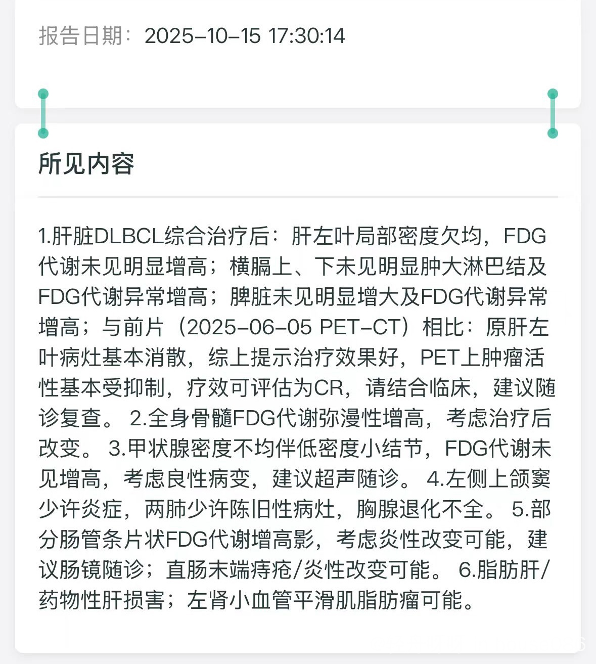 家属使用高罗华3次后CMR,7次后PETCT第一次治疗残留的肿瘤尸体也都打没了,效果出乎意料。