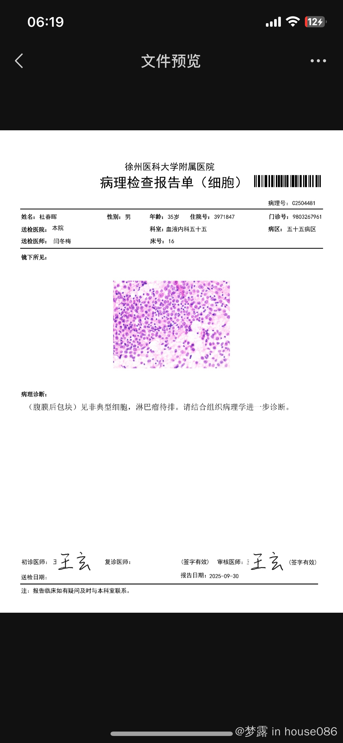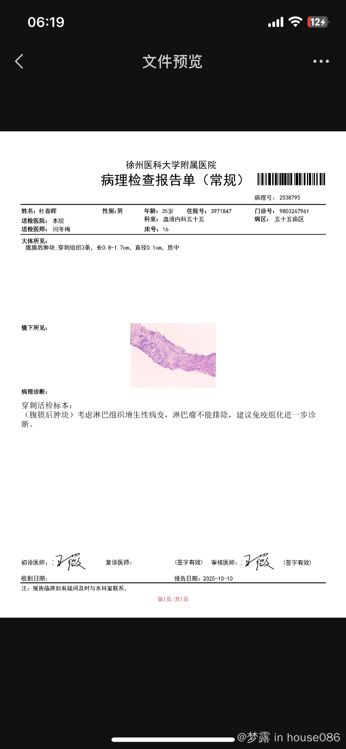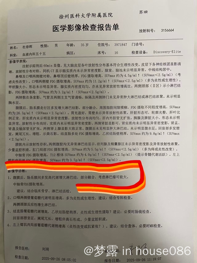 梦露 发表于 2025-10-16 18:46 就是我们徐州这边最好的医院,徐州二院,医生今天告诉我是因为病理活检取得组织少,所以免疫组化出来的报告不是很理想,就是说还是没确诊,我想带着活检病理去大城市,还是去大地方重新做活检呢