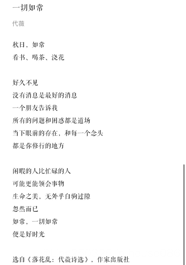 昨夜的小青松艺术疗愈群的诗歌朗诵会结束了,但那份温暖依然在胸口回荡。因为晩上不方便读所以下午给小伙伴们录读了代薇的《一切如常》这首诗。