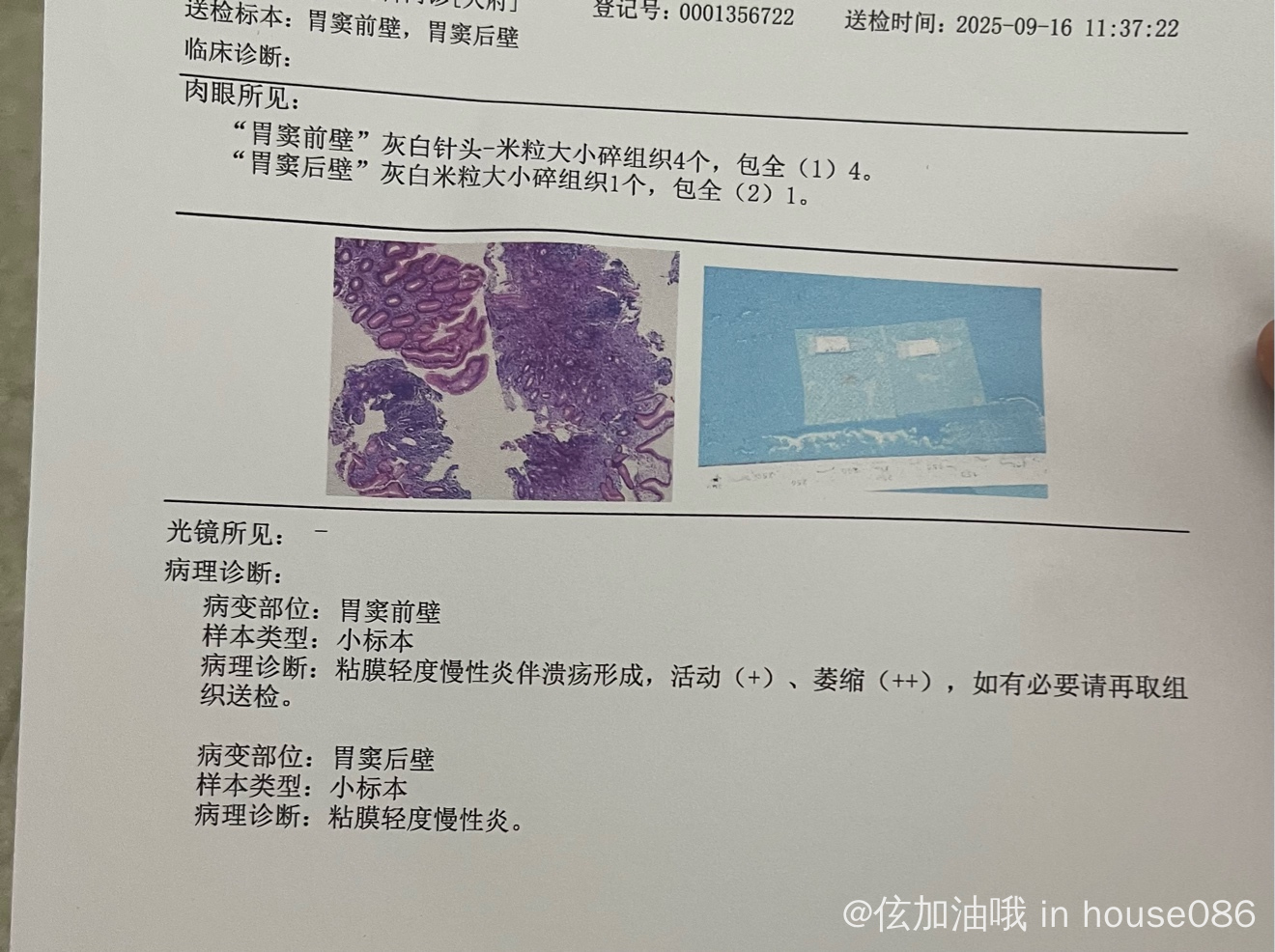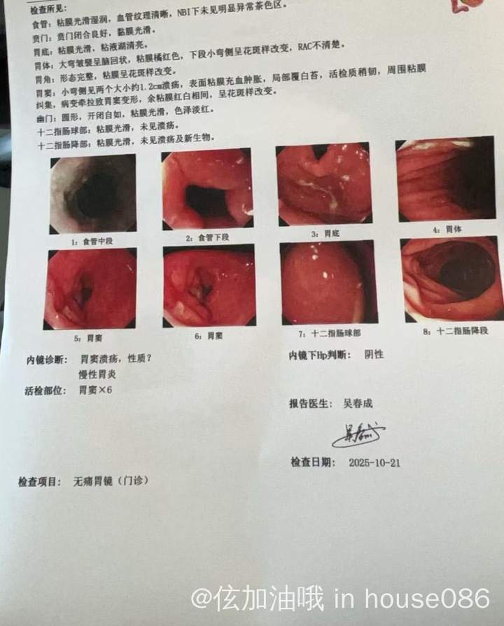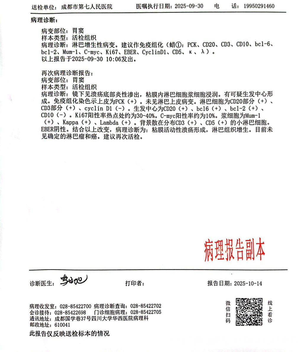 图1是第一次胃镜检查结果,因为当时溃疡很大怀疑胃癌但是活检显示只是炎症,此时已经做了增强CT发现胃窦周围有淋巴结转移怀疑胃癌中晚期,所以间隔不到一周做了第二次胃镜(第二次胃镜结果和第一次基本相同所以没再放图),之后做了病理和免疫组化,免疫组化提示可能是淋巴瘤,所以去了华西医院,PET也是疑似恶性肿瘤与此同时借了第二次取样的标本送往华西医院送检,如图四显示就是淋巴增生,之后在今天在华西医院做了第三次胃镜,目前正在等待第三次活检结果,距离第一次胃镜已经一个月了,两次胃镜对比来看溃疡有明显缩小,不清楚是不同医院仪器差别太大还是真的缩小很多,最后一张是近期吃的药是上一个医院开的(停了将近两周了)因为PET显示肺部也有炎症咨询医生吃了头孢,有无大神可以帮忙分析一下。(病人在第一次胃镜之前出现了肋骨疼、后背疼的现象,疼的受不了的时候甚至腿上都会有像毛细血管冒出来了的那种红点但是我上网查了不是淋巴瘤典型皮疹,之后做第一次胃镜到现在基本没有疼痛了,但是偶尔胃会有灼烧感,还比较能吃,体重最近略微上升)