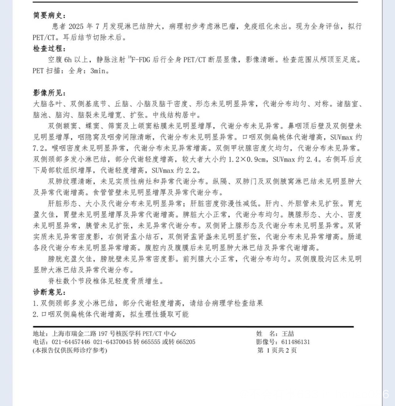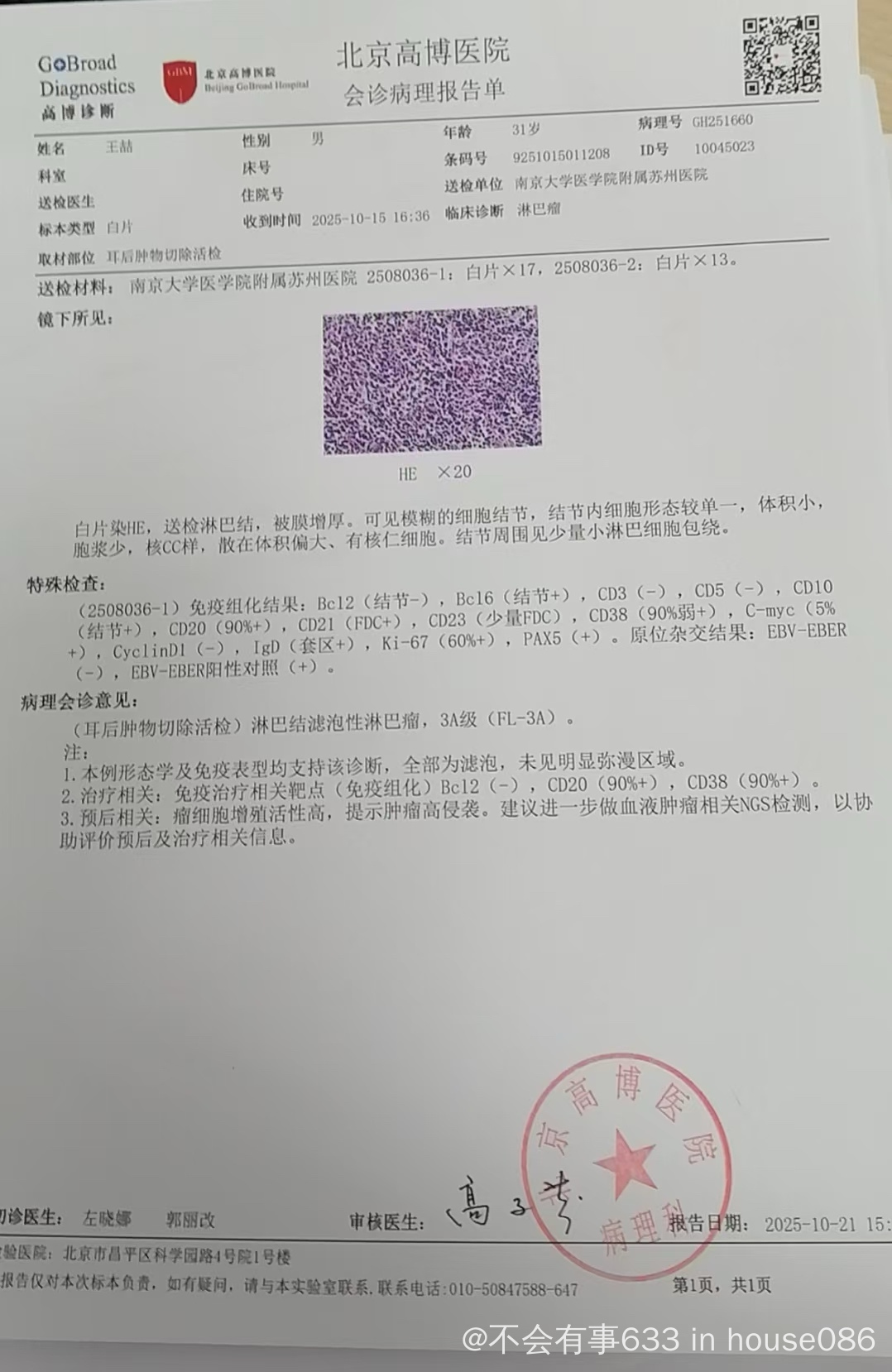 病理报告滤泡性淋巴瘤1-2级